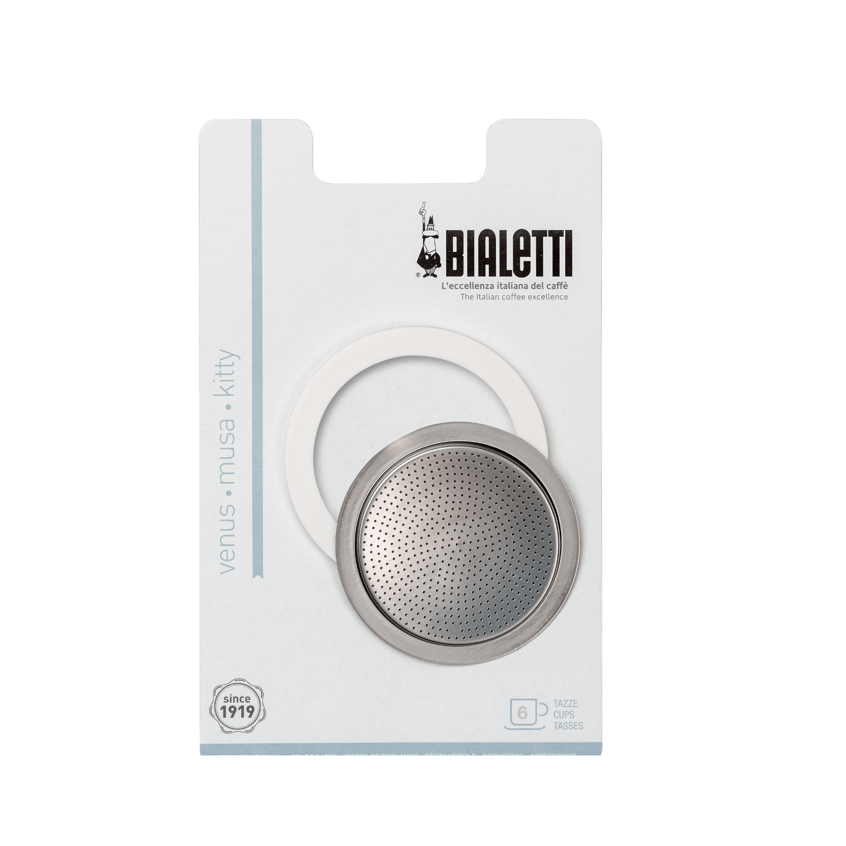 La confezione contiene 1 guarnizione e 1 filtro per caffettiera Bialetti 6 TAZZE modello VENUS MUSA KITTY 6TZ