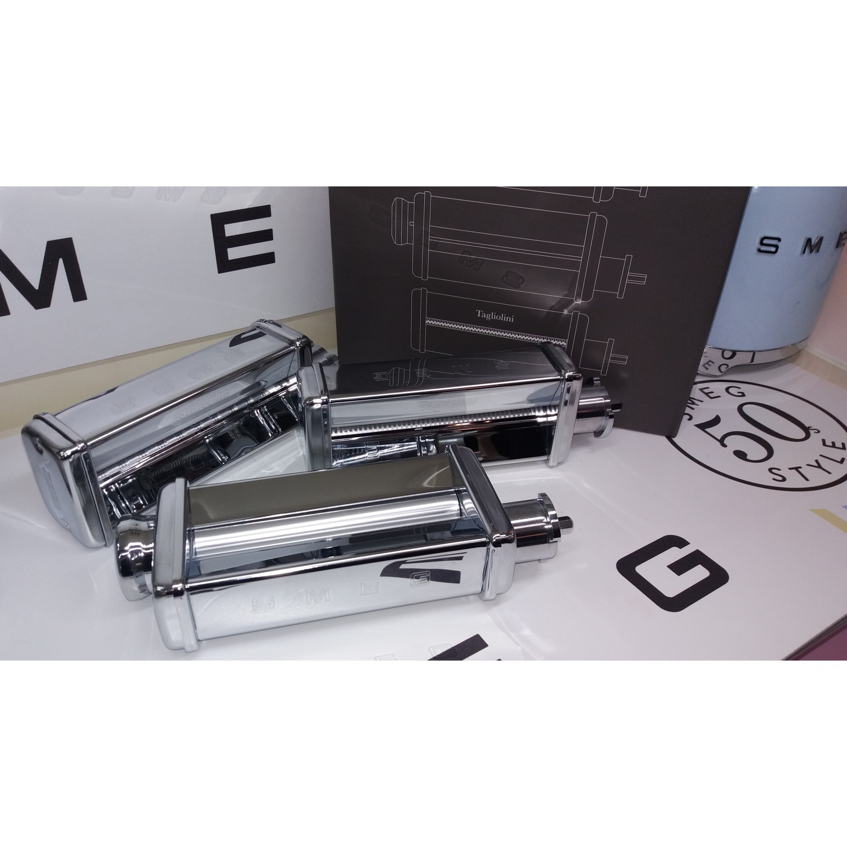 SET accessorio opzionale per impastatrice planetaria SMEG SMF01, composto da Sfogliatrice per tirare la pasta, accessori Tagliatelle/Fettuccine e Tagliolini. Il Kit formato dai 3 accessori indispensabili per preparare ogni formato di pasta.