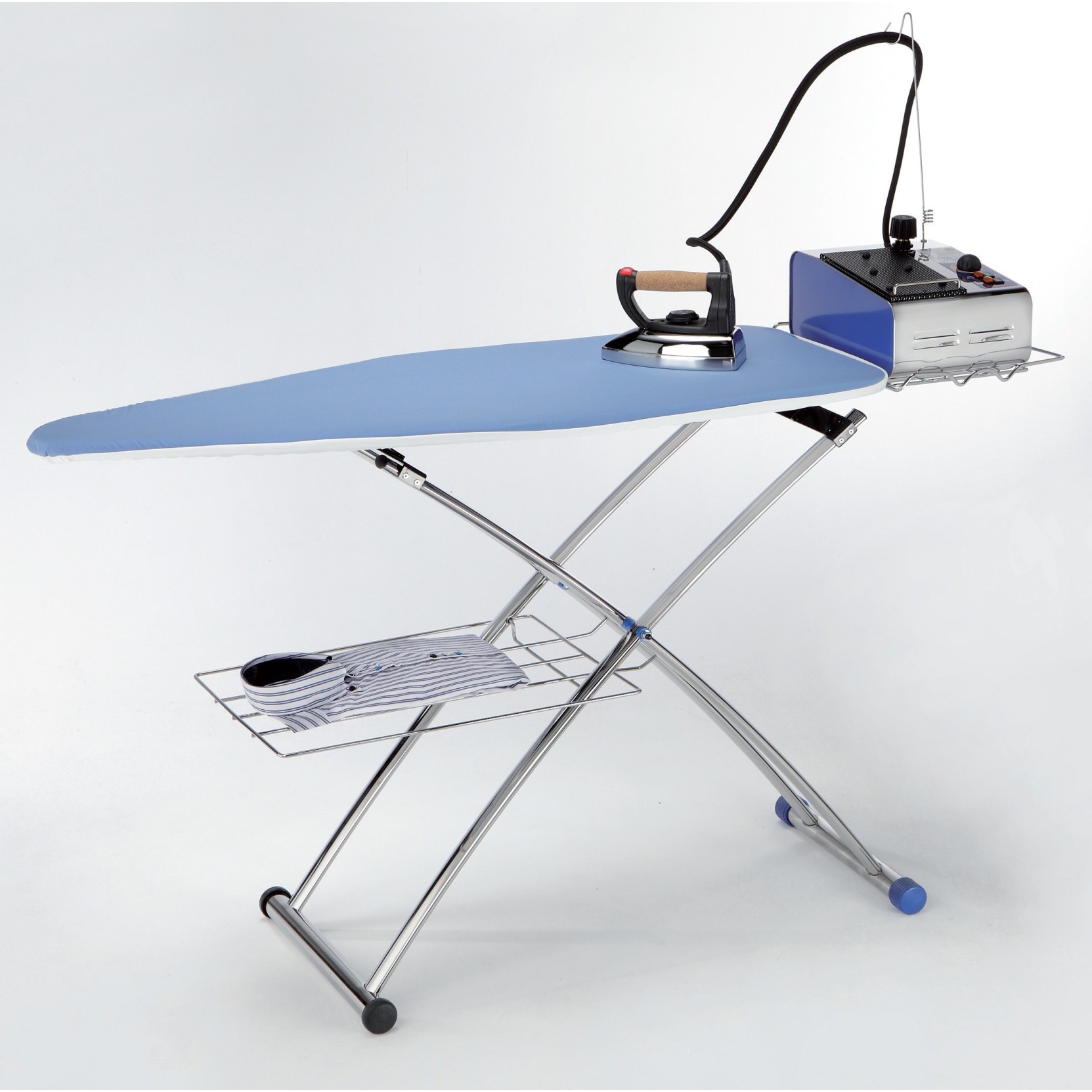 Asse da stiro di grandi dimensioni con comode ruote per un facile spostamento.