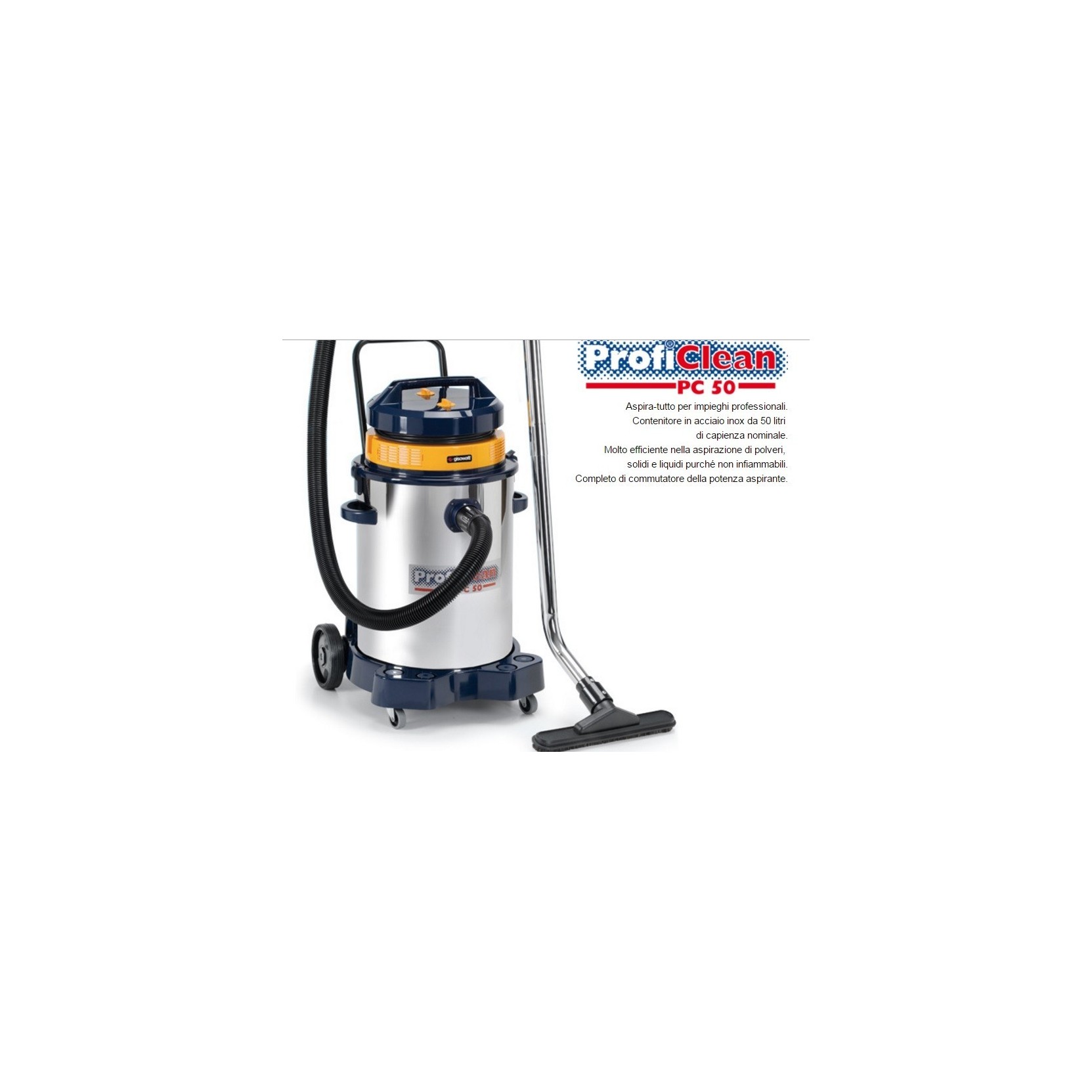 ASPIRATUTTO per uso professionale adatto per grandi e medie superfici. Il contenitore è in acciaio inox, capienza 50. lt, ed è adatto per i lavori più impegnativi e per l'aspirazione di solidi, polveri e liquidi purchè non infiammabili. Apparecchio dotato di commutatore della potenza aspirante per uso differenziato a seconda degli impieghi. PRODOTTO MADE IN ITALY,