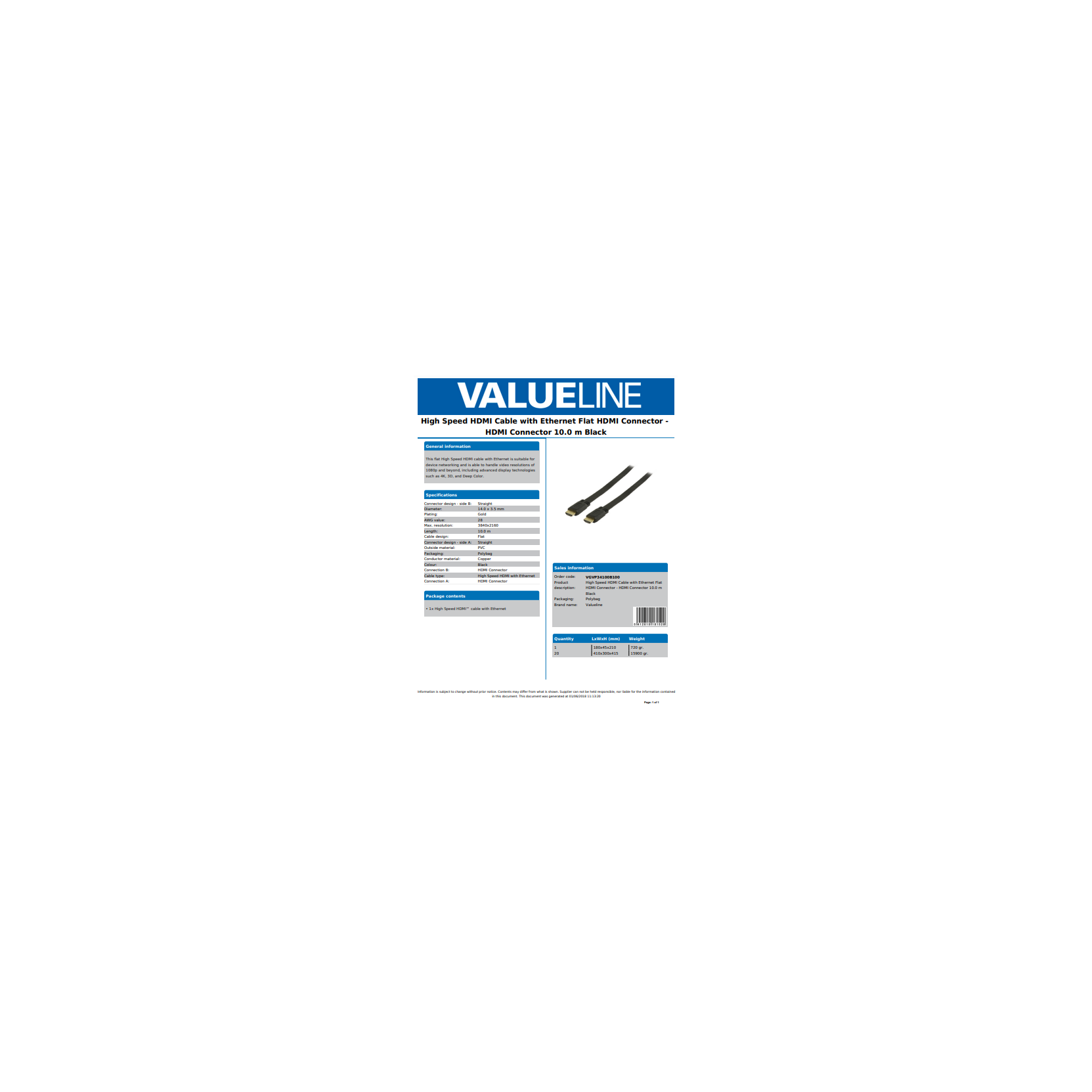 Cavo di connessione HDMI maschio/maschio lunghezza 10metri filo FLAT VALUELINE VGVP34100B100 Hight Speed HDMI flat cable Ethernet connetctor Maschio/Maschio.