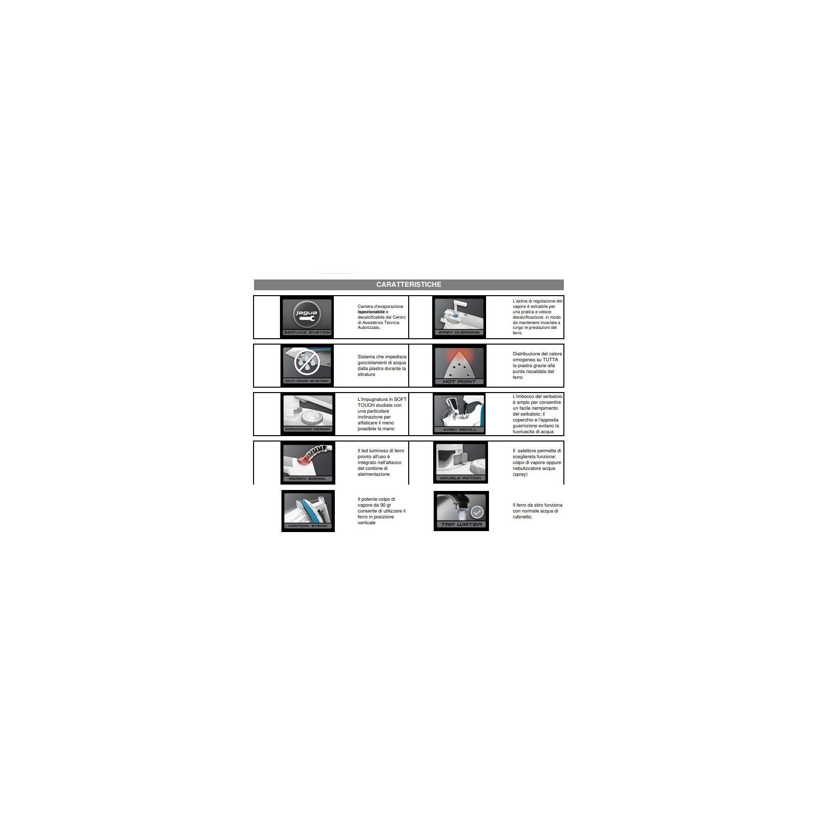 Camera d'evaporazione ispezionabile e decalcificabile dal Centro di Assistenza Tecnica Autorizzato. L'astina di regolazione del vapore è estraibile per una pratica e veloce decalcificazione, in modo da mantenere invariate a lungo le prestazioni del ferro Sistema che impedisce gocciolamenti di acqua dalla piastra durante la stiratura Distribuzione del calore omogenea su TUTTA la piastra grazie alla punta riscaldata del ferro L'impugnatura in SOFT TOUCH studiata con una particolare inclinazione per affaticare il meno possibile la mano L'imbocco del serbatoio è ampio per consentire un facile riempimento del serbatoio; il coperchio e l'apposita guarnizione evitano la fuoriuscita di acqua Il led luminoso di ferro pronto all'uso è integrato nell'attacco del cordone di aleimentazione Il selettore permette di sceglierela funzione: colpo di vapore oppure nebulizzatore acqua (spray) Il potente colpo di vapore da 90 gr consente di utilizzare il ferro in posizione verticale Il ferro da stiro funziona con normale acqua di rubinetto.
