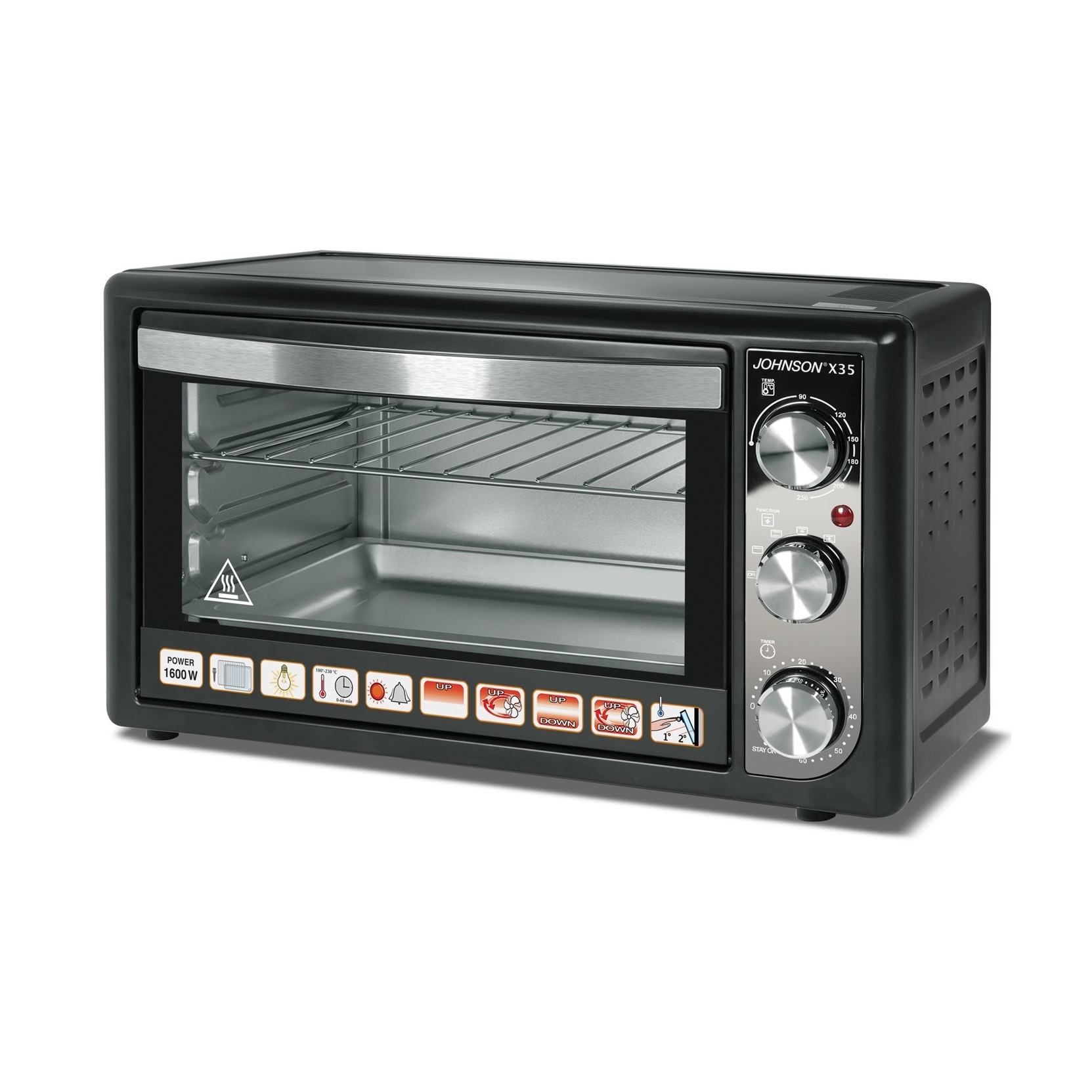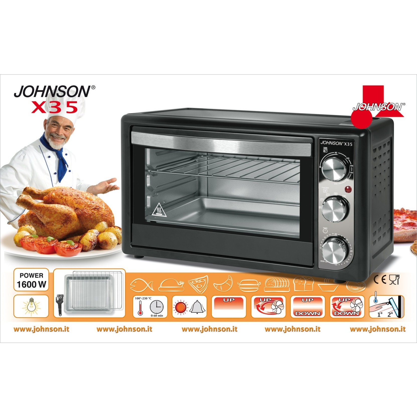 JOHNSONFornetto elettrico da appoggiare con funzione statico e ventilato e grill, capacità 35litri. 4 Funzioni di cottura, luce interna, sportello a doppio vetro, timer e termostato. Finiture inox e nero, cassa bianca.