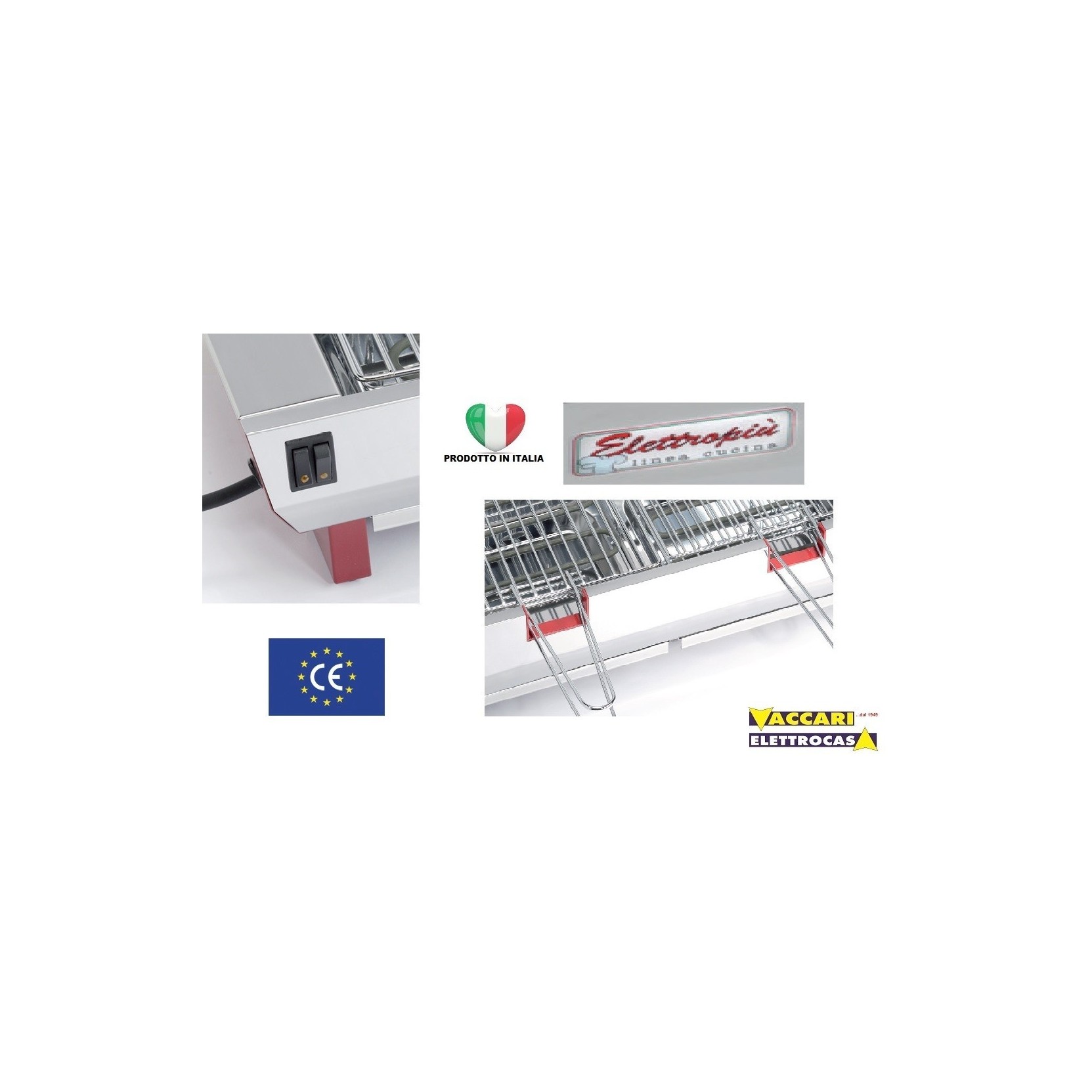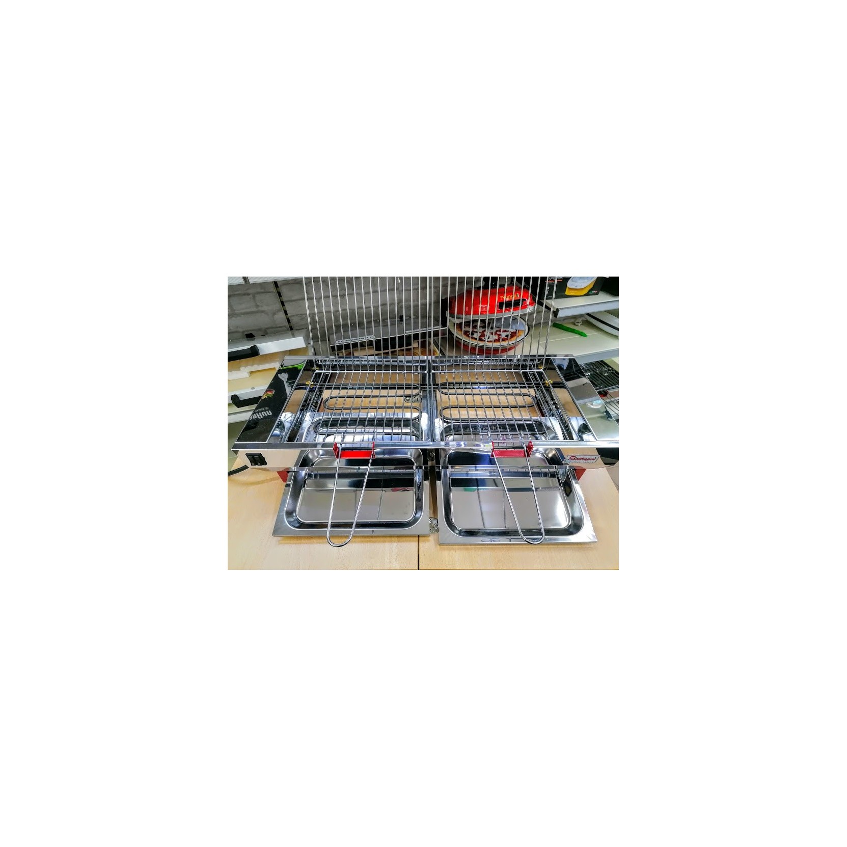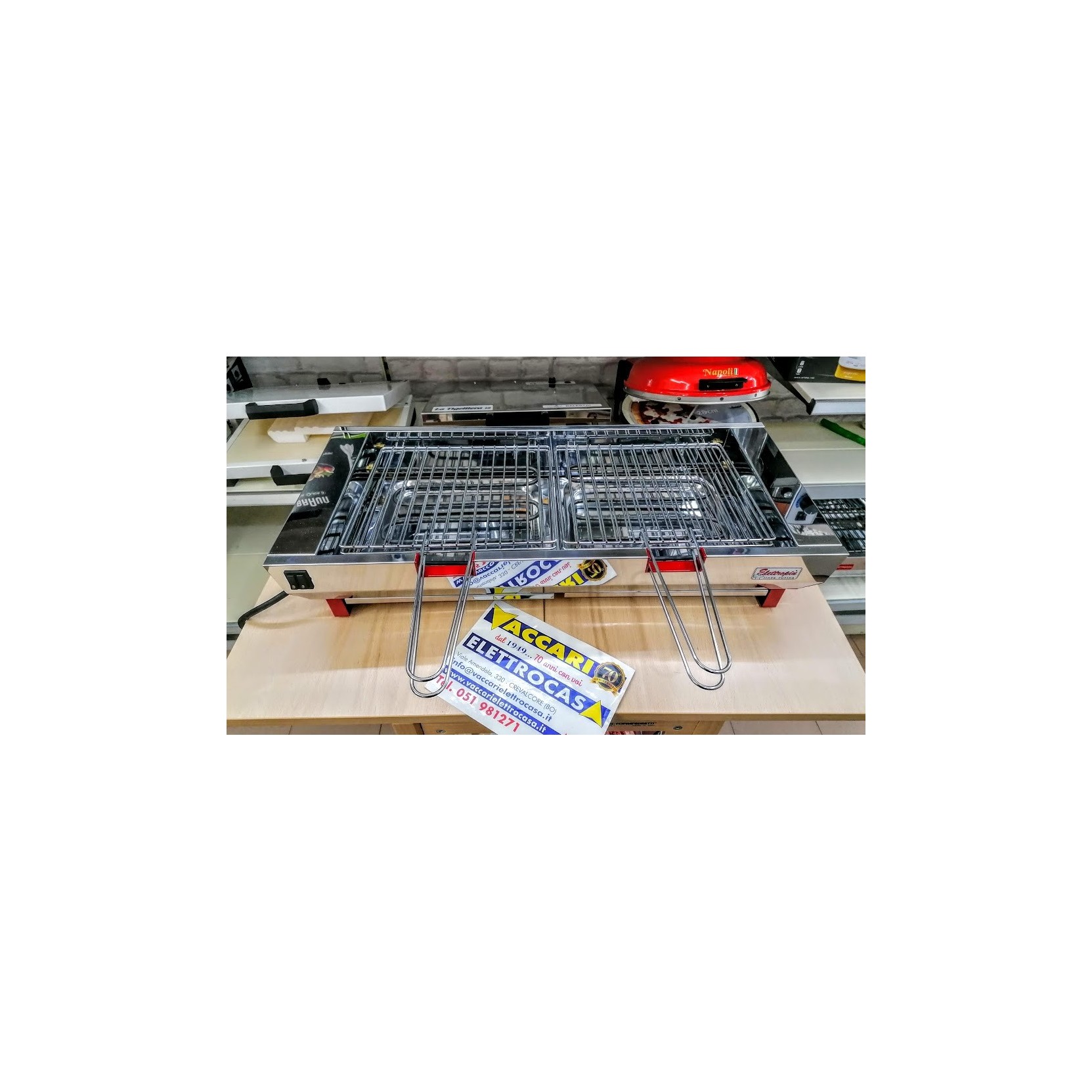Grande Bistecchiera a DOPPIA GRIGLIA per cucinare separatamente carne, pesce, verdure e tutte le tue specialità. Accensione separata per grandi o piccole grigliate. Struttura in acciaio inox indistruttibile, griglie apribili in acciaio cromato. Resistenze corazzate autopulenti, bacinella raccogli gocce con indicazione livello acqua per evitare fumo e cattivi odori. Facile pulizia.MADE IN ITALY