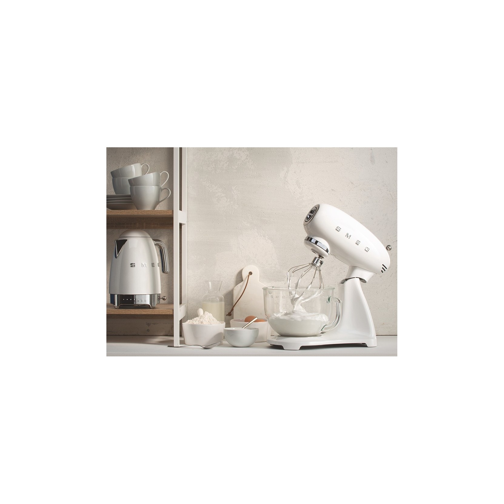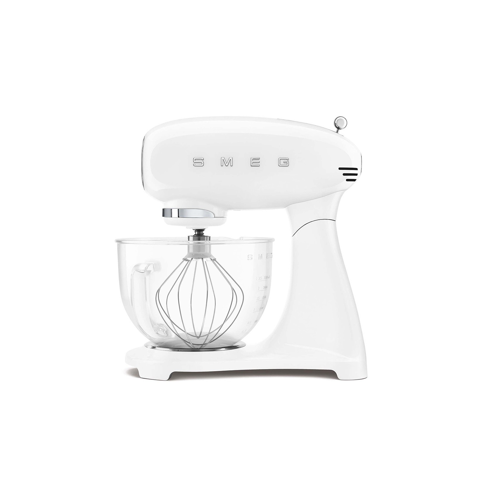 Planetaria Smeg nuovo colore Bianco Full Color con ciotola in vetro. L'impastatrice Smeg Bianca è dotata di frusta con bordi, Frusta a filo e kappa. Il Colore bianco candido con finiture cromo