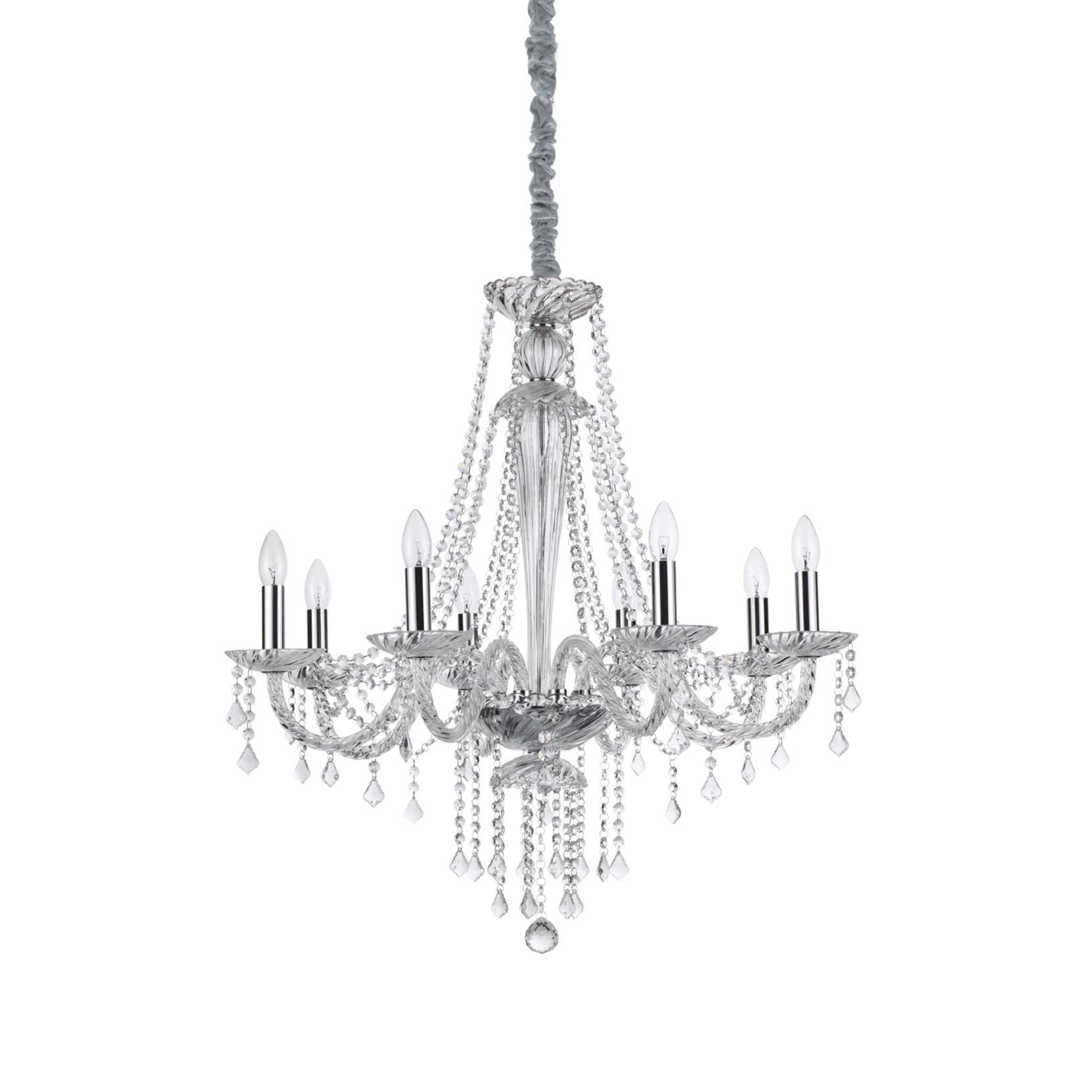 Amadeus sp8 di Ideallux è un lampadario classico con bracci e pendenti in cristallo, Lampadario sospensione con montatura metallo cromato ed elementi decorativi in