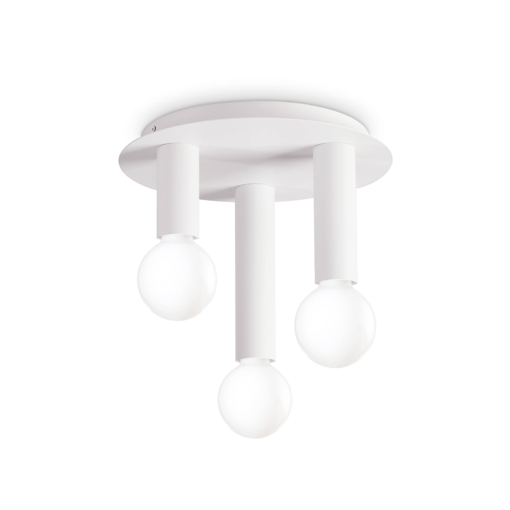 Plafoniera moderna a 3 cilindri base tonda lampade a vista PETITI PL3 DI IDEALLUX è una lampada da soffitto in metallo disponibile nei colori bianco opaco e oro spazzolato. Linea minimal molto luminosa grazie alle lampade a vista con attacco E27 ideale per chi cerca una plafoniera moderna e comoda.