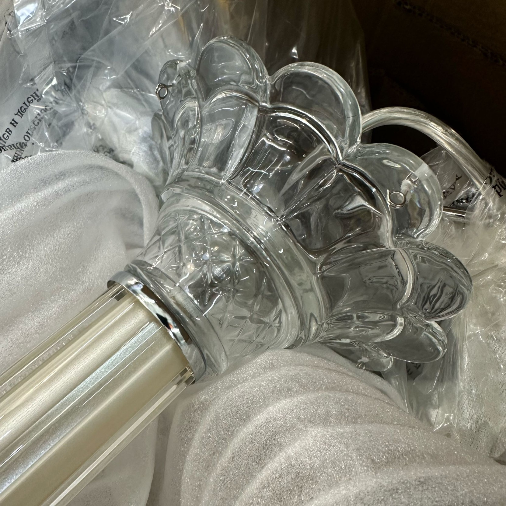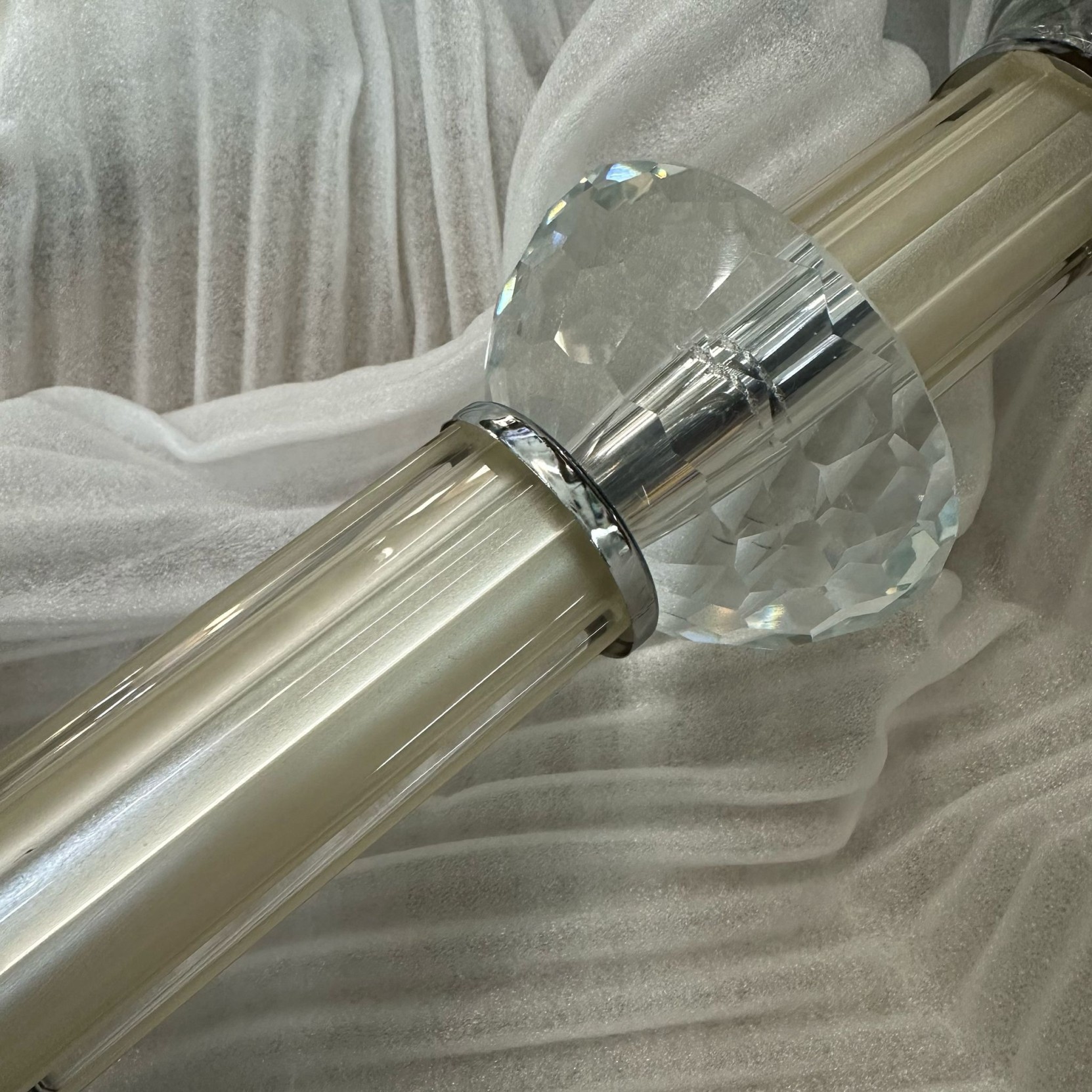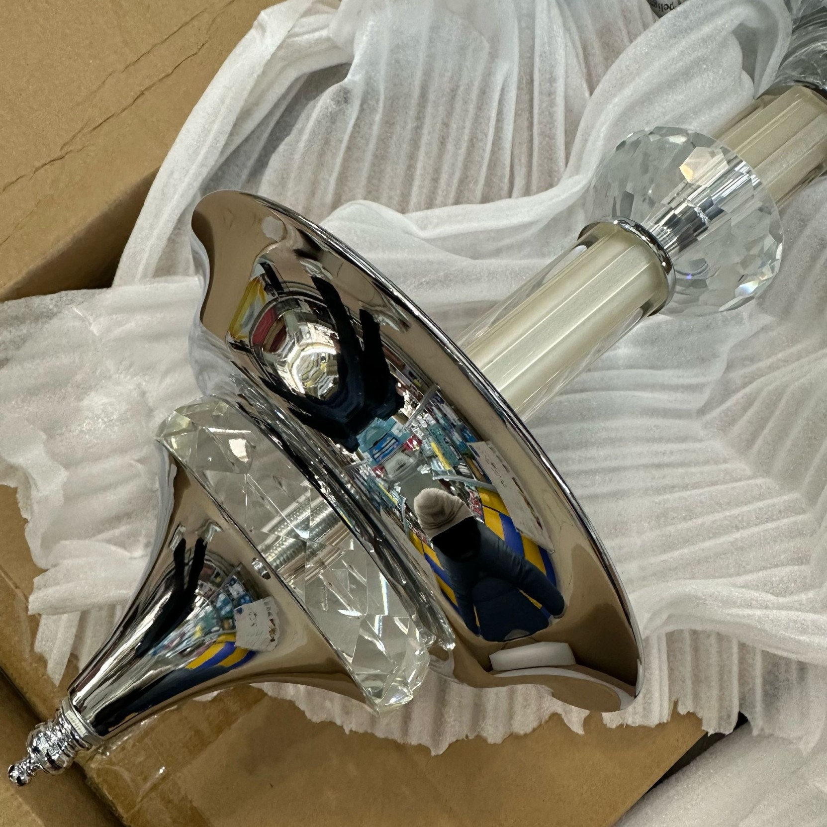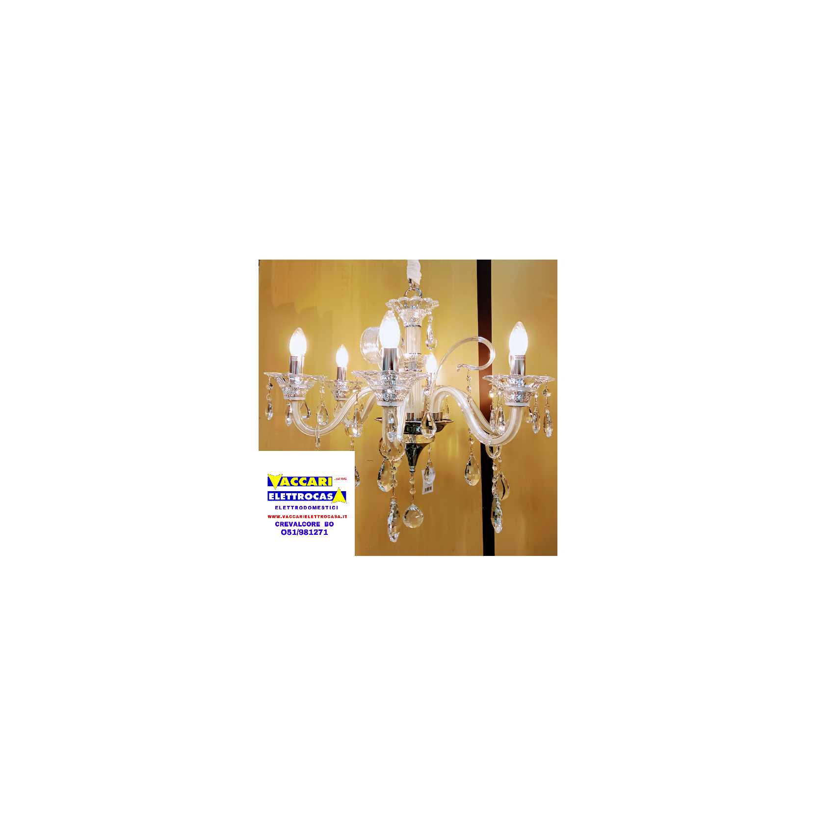 Lampadario classico 6 bracci elegante nella sua rifinitura avorio, montatura e dettagli in metallo cromato. Bracci in vetro soffiato con interno colore avorio. Pendagli ed elementi decorativi in vetro trasparente e cristallo molato. Copricatena in velluto (lampadine non comprese)