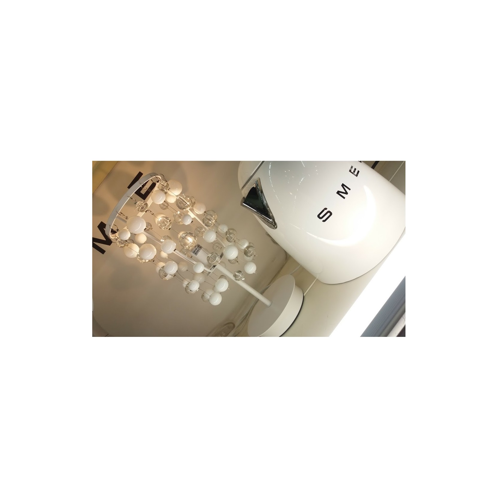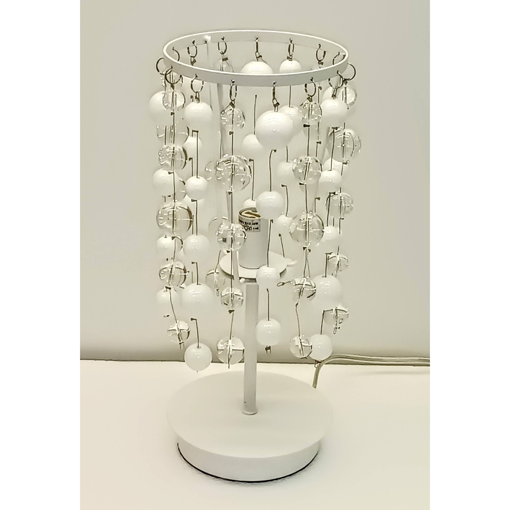 Neve TL1 BIANCA Ideallux lampada da tavolo Piccola e originale la lampada da comodino con sfere di vetro bianco e trasparenze effetto neve. montatura bianco opaco e e paralume di perle sfere a cascata bianche e trasparenti  Attacco G9 per lampada a Led, filo trasparente, interruttore lungo cavo.