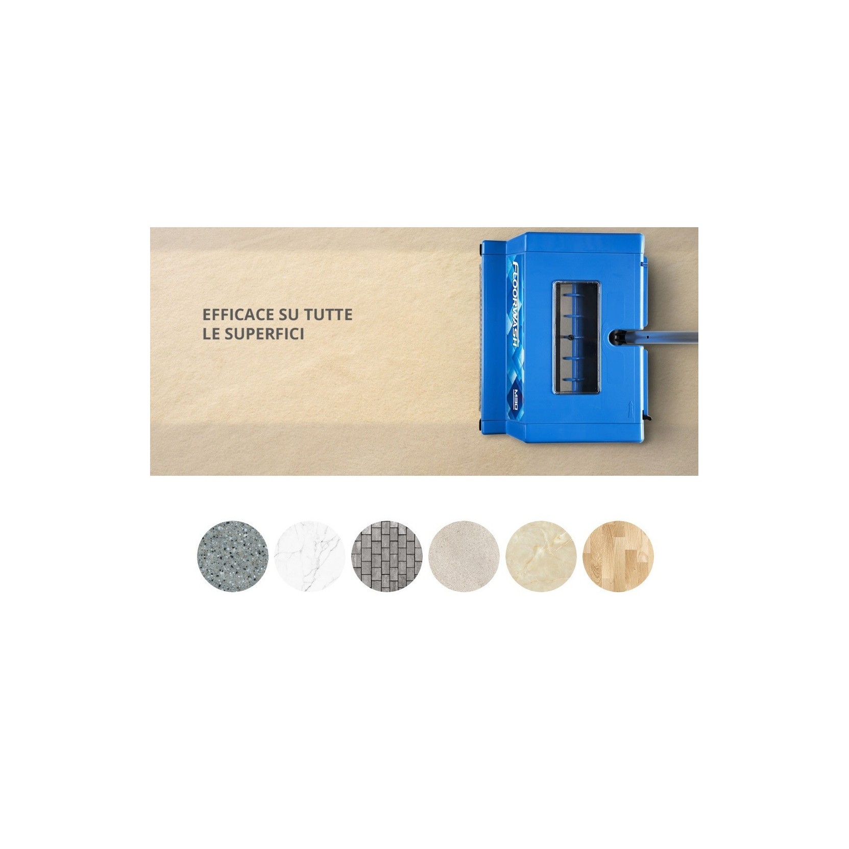 Lava la superficie con l'acqua Sfrega lo sporco più nascosto: nessun riparo per fughe, porosità, angoli Raccoglie completamente l'acqua sporca compresi peli, polvere, briciole.