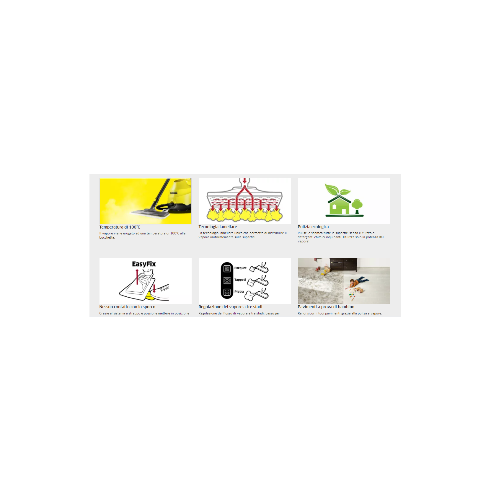 SC 3 UPRIGHT EasyFix di Karcher è la scopa a vapore subito pronta, igienizza e pulisce in profondita con solo la forza del vapore. Utilizza acqua di rubinetto e rimuove il 99,9 dei batteri Pronta in pochi minuti, leggera e maneggevole sempre pronta per disinfettare e pulire pavimenti, tappeti.