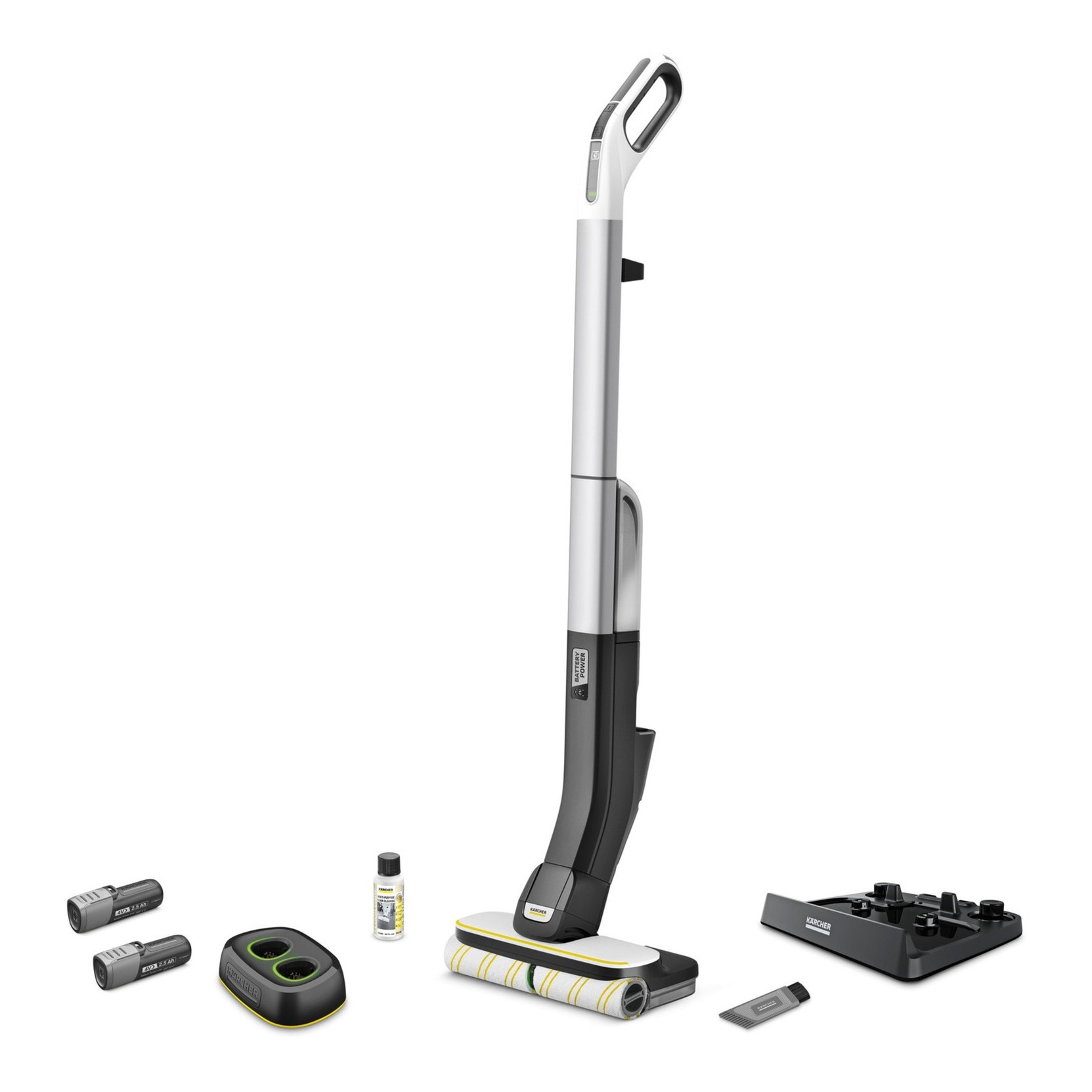 Con il lavapavimenti KARCHER FC 4-4 non è più necessario passare l'aspirapolvere prima di pulire e si può rimuovere lo sporco quotidiano in un solo passaggio. Con la durata della batteria fino a 30 minuti, è possibile pulire senza sforzo aree fino a 90 metri quadrati. Il caricabatterie rapido Duo in dotazione consente la ricarica in soli 70 minuti. Un segnale visivo viene utilizzato per comunicare quando è necessario riempire il serbatoio dell'acqua pulita e svuotare il serbatoio dell'acqua sporca. Dopo aver attivato il dispositivo, i due rulli vengono automaticamente inumiditi con l'acqua pulita del serbatoio. L'FC 4-4 pulisce anche i punti difficili da raggiungere e raccoglie facilmente i capelli. Il contatto diretto con lo sporco viene evitato grazie al serbatoio dell'acqua sporca integrato, che può essere rimosso e pulito dopo l'utilizzo del dispositivo. L'FC 4-4 sta in piedi da solo e può essere riposto in modo salvaspazio grazie alla sua maniglia rimovibile. Il dispositivo è adatto a tutti i pavimenti duri. Le batterie intercambiabili Kärcher Battery Power da 4 V sono compatibili con tutti i dispositivi Kärcher Battery Power da 4 V.