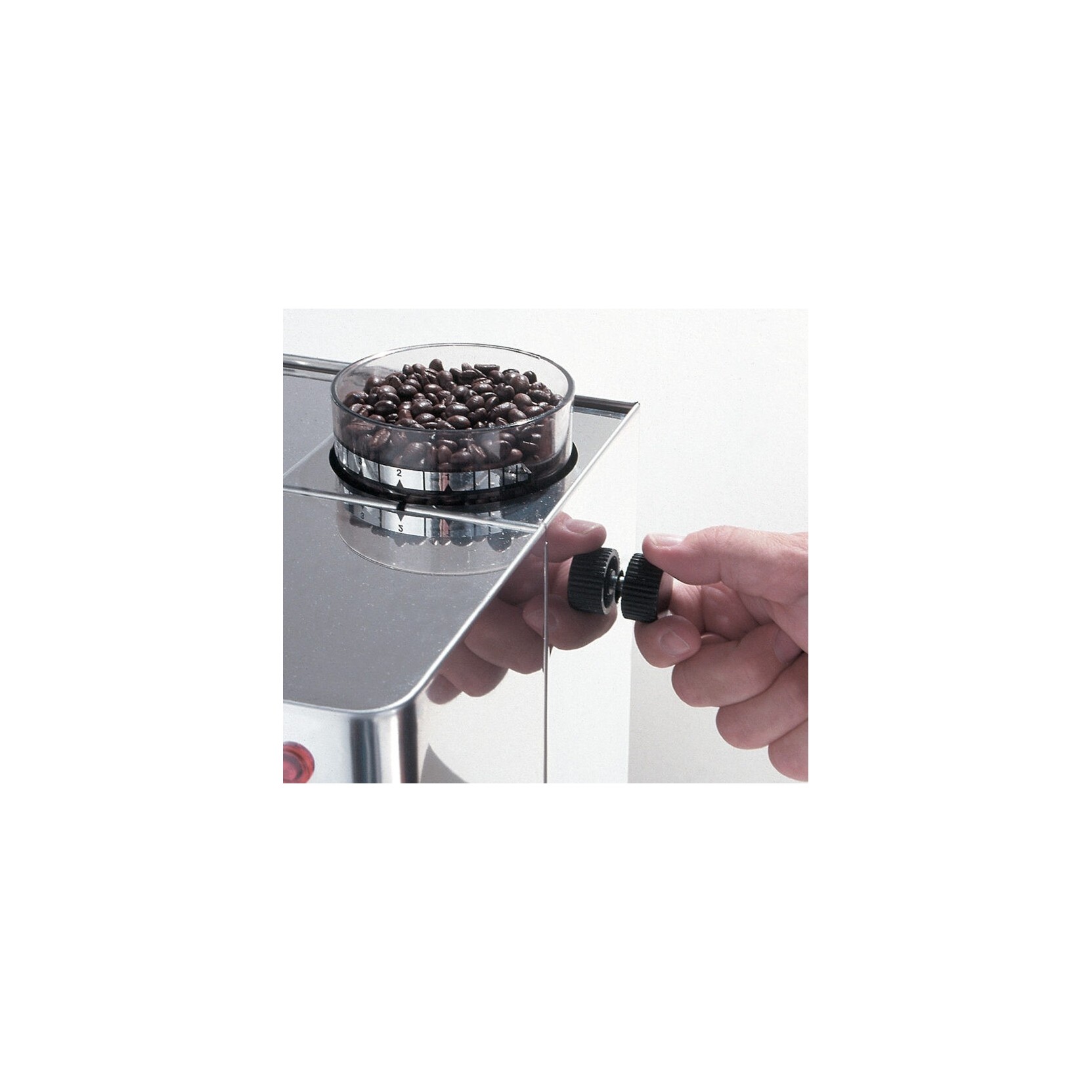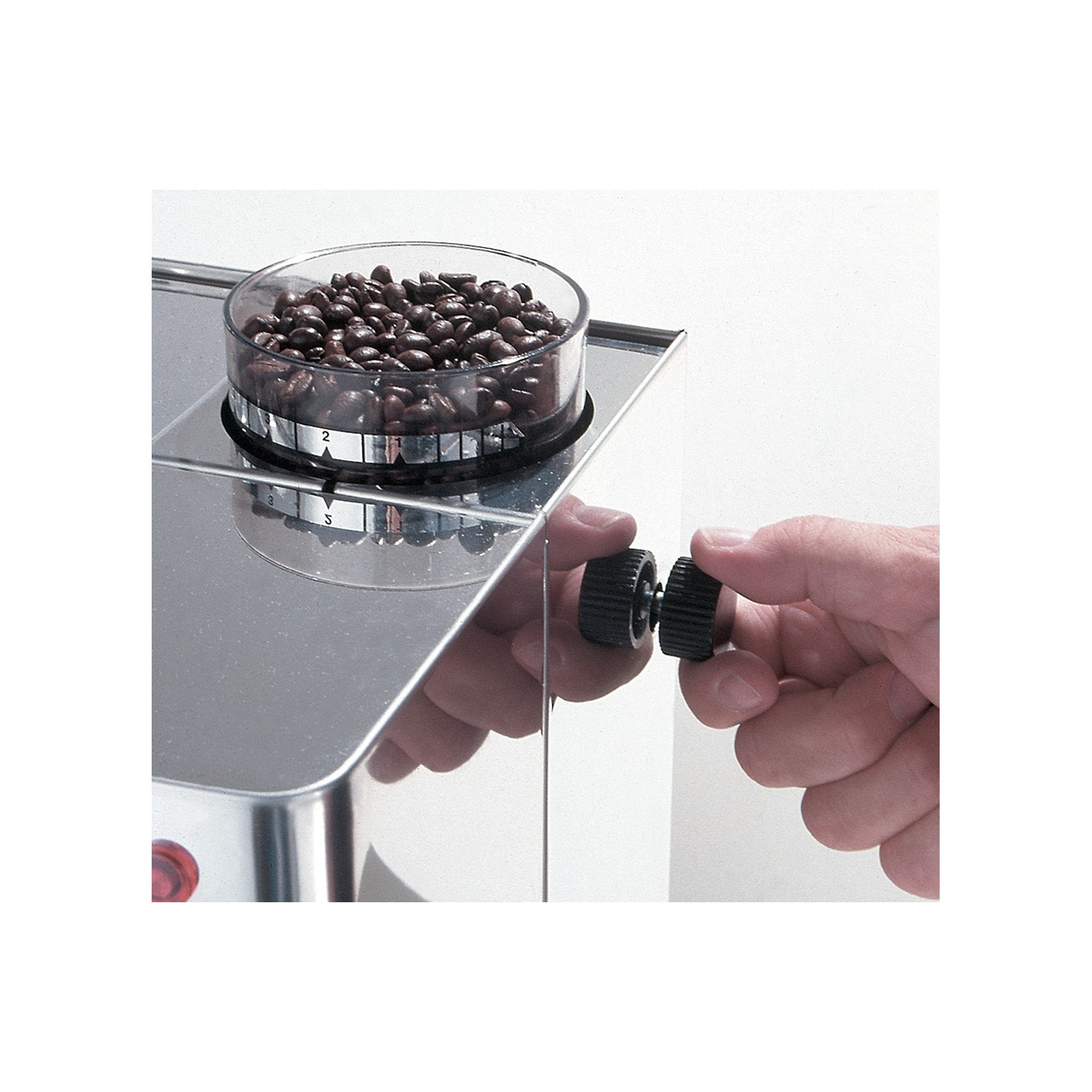 Macina caffè con macinatura regolabile in 7 posizioni mediante una manopola. La bassa velocità delle macine coniche impedisce la bruciatura del caffè in grani.