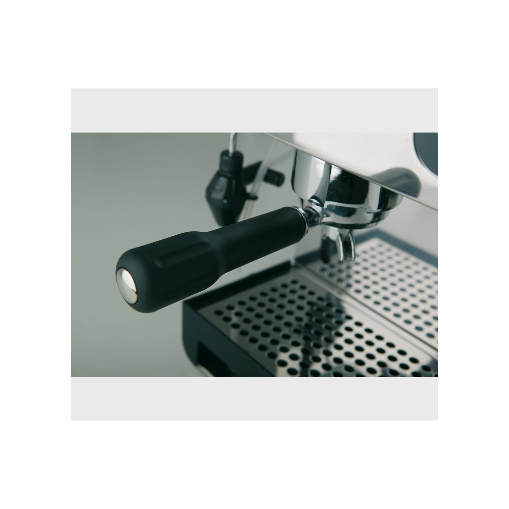Portafiltro professionale in ottone cromato dotato di filtro per 1 dose 8 g, e per 2 dosi 16 g di caffè. Pressino per il caffè macinato incorporato nella macchina.