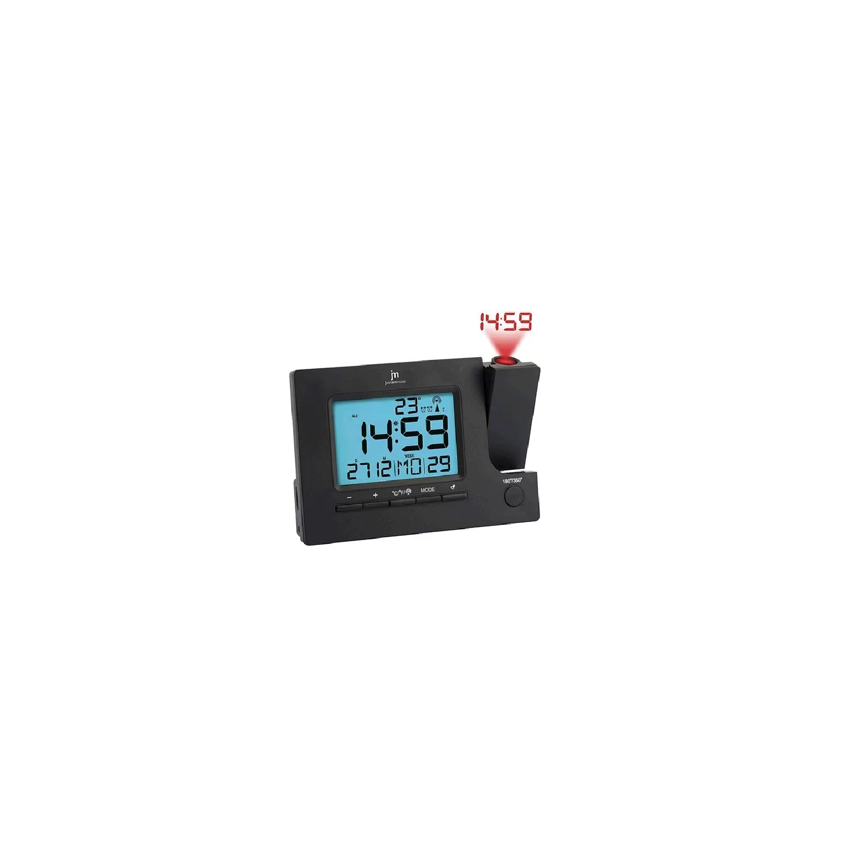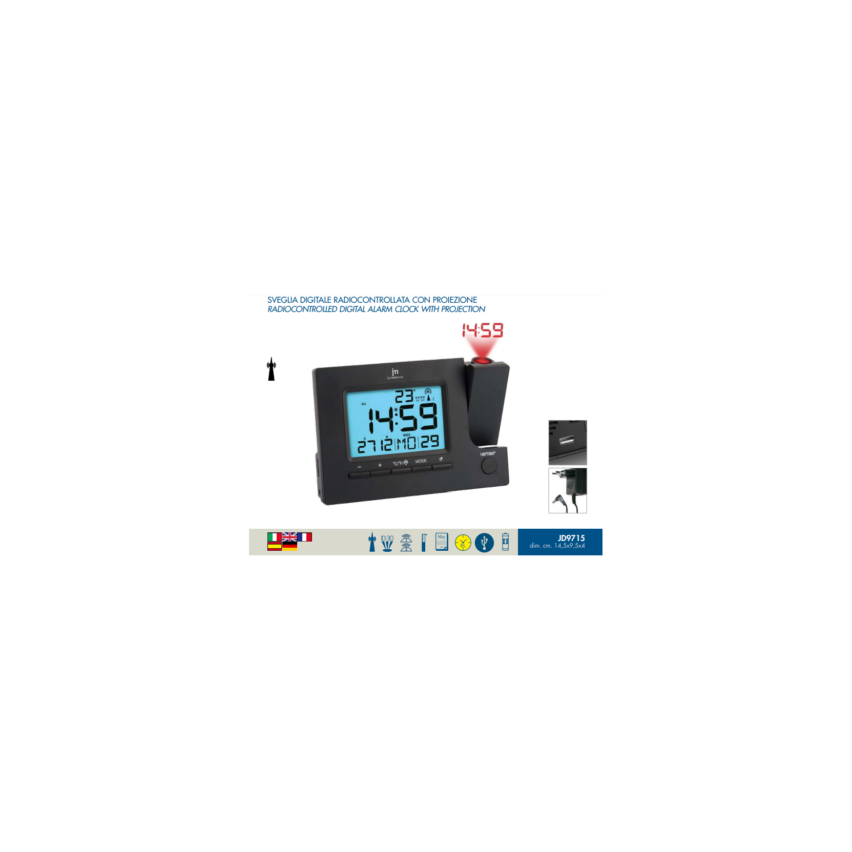 jd9715 sveglia digitale con proiezione a muro dell'ora, Sveglia digitale radiocontrollata con proiezione orario o temperatura (alternate). Rilevazione della temperatura interna. Calendario giorno/mese/ anno/giorno della settimana) disponibile in 5 lingue. Luce elettroluminescente a spegnimento ritardato. Porta USB per carica dispositivo mobile. Doppio allarme. Luce elettroluminescente a spegnimento ritardato. Possibilità di visualizzare un secondo orario. Adattatore 5V incluso