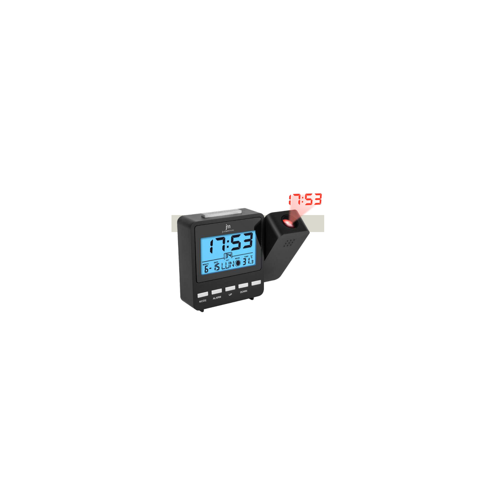 Sveglia digitale al quarzo con proiezione, luce elettroluminescente a spegnimento ritardato e snooze (ripetizione dopo 5 minuti). Rilevazione della temperatura interna. Calendario (giorno, mese, anno), con giorno della settimana disponibile in 7 lingue (italiano, inglese, tedesco, francese, spagnolo, olandese, danese). Visualizzazione delle fasi lunari. La proiezione dell’orario è attivabile tramite pressione dell’apposito tasto posto nella parte superiore della sveglia.