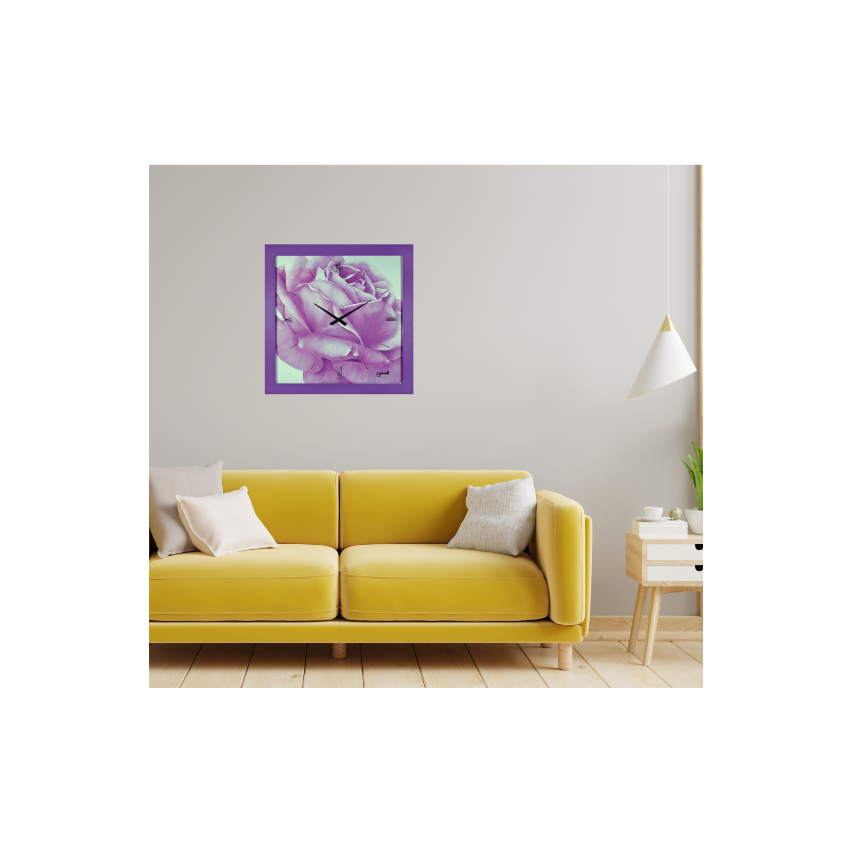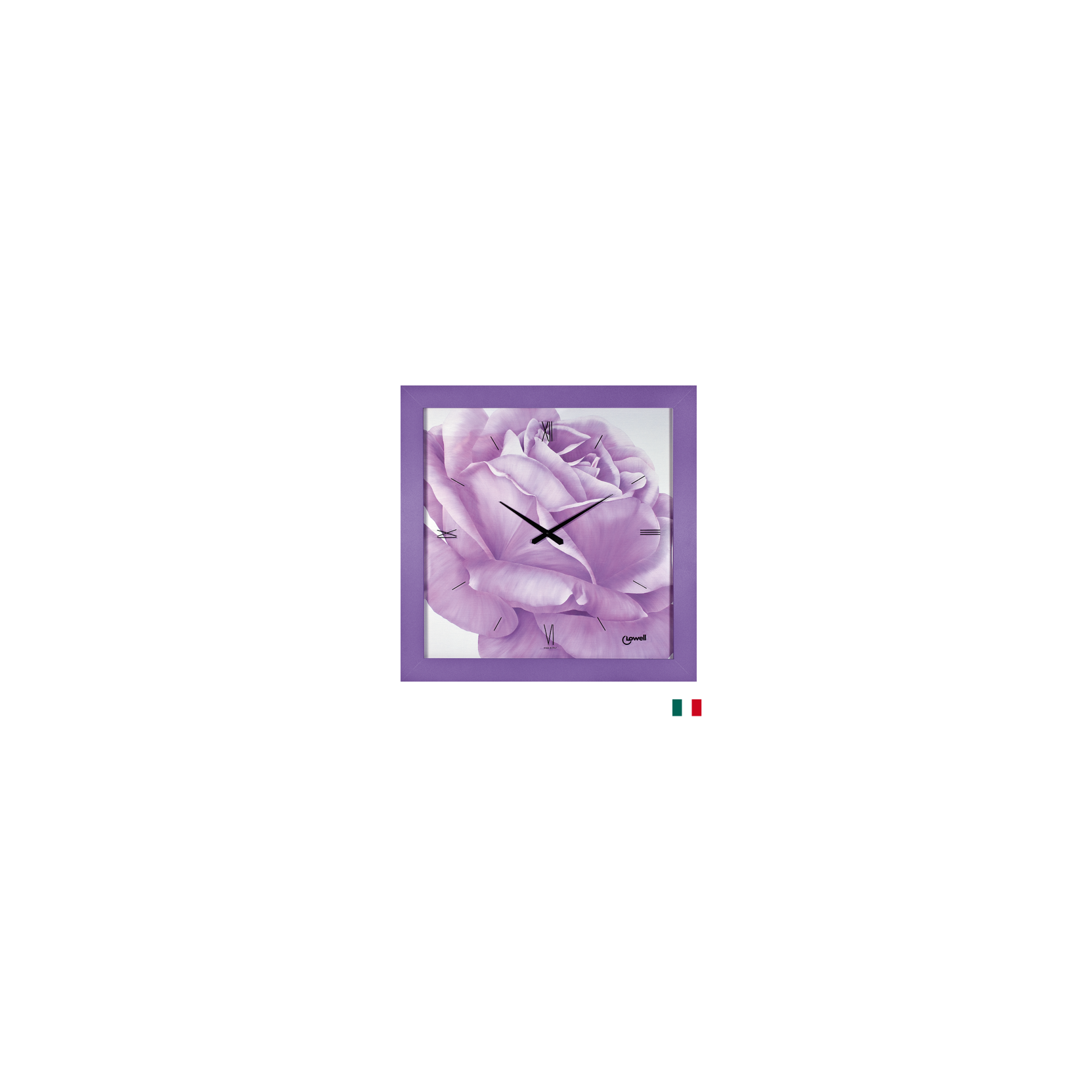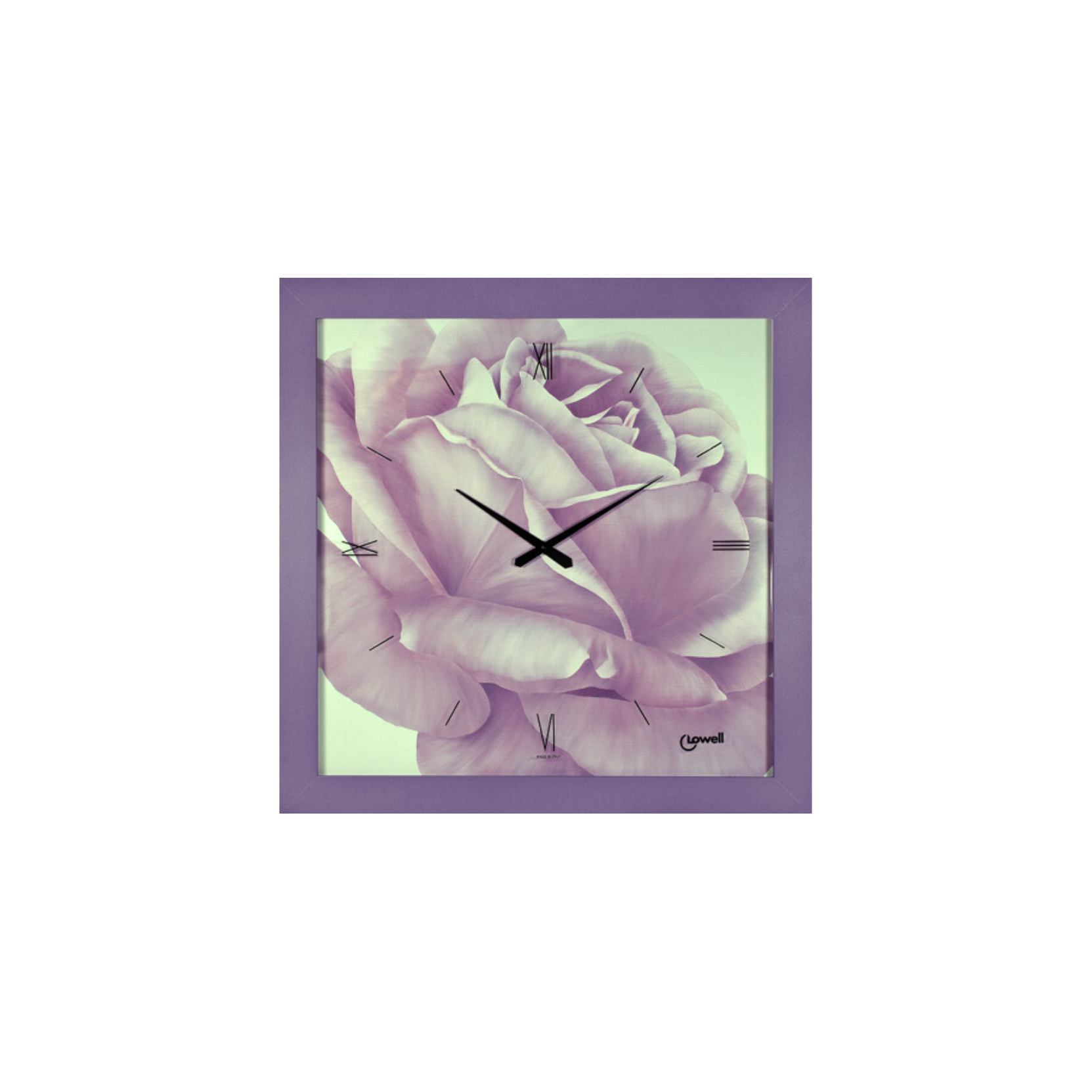 11790 Lowell Grande orologio quadro raffigurante una rosa Viola con sfumature. Orologio da parete con movimento al quarzo. Cassa in legno rifinita con una verniciatura opaca a tinta pastello viola Sfondo del quadrante, montato su pannello, realizzato con una stampa artistica mentre gli indici sono serigrafati a mano sul lato interno della lastra di vetro. SILENZIOSO.