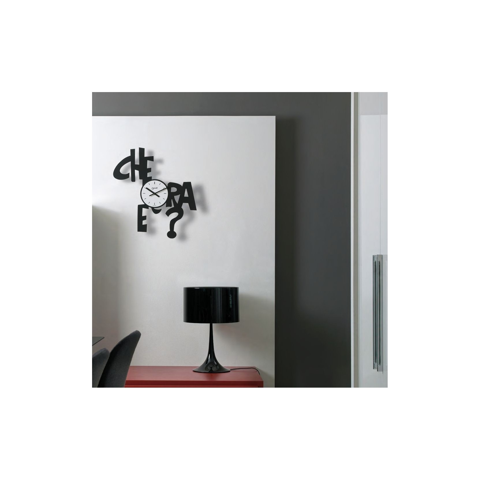 Orologio originale da parete con scritta in metallo nero CHE ORA E? La forma dell'orologio è la scritta in metallo nero con interno in vetro satinato serigrafato