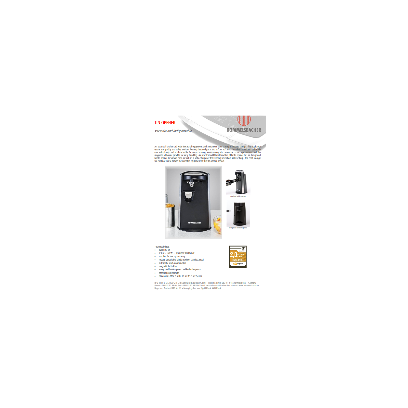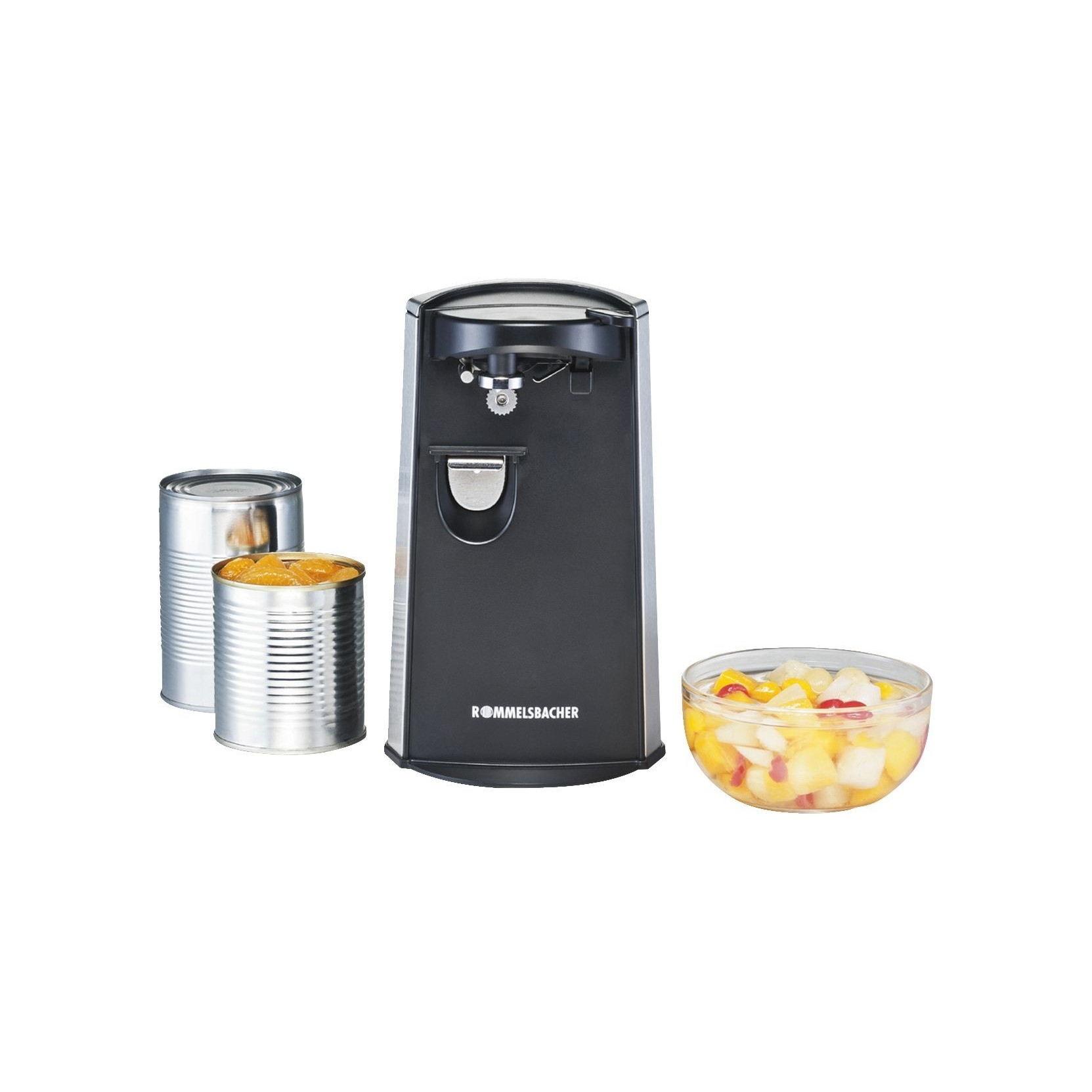 Apriscatole elettrico Rommelsbacher DO65 per aprire facilmente ogni tipo di scatoletta in metallo per alimenti. Apre le latte di pomodoro facilmente e senza fatica, inoltre può affilare le lame dei coltelli ed ha un comodo apribottiglie integrato. L'apriscatole elettrico è comodissimo per aprire senza tagliarsi ogni scatoletta in cucina.