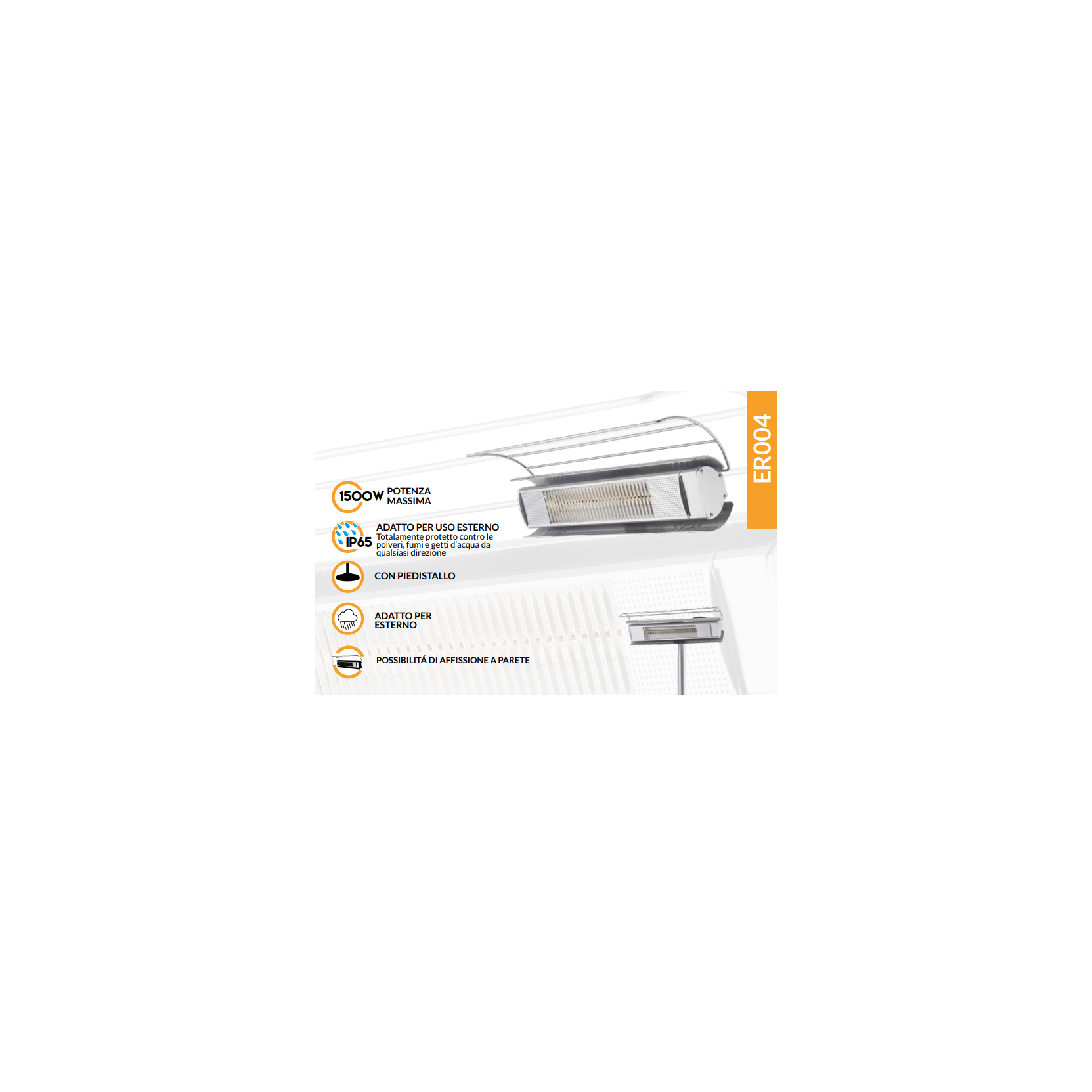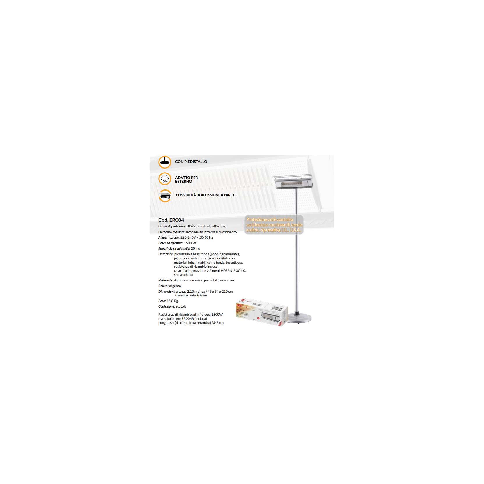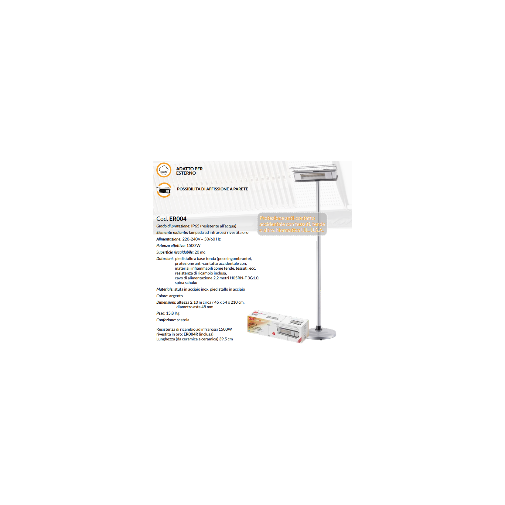 1500W IP65 POTENZA MASSIMA ADATTO PER ESTERNO CON PIEDISTALLO POSSIBILITÁ DI AFFISSIONE A PARETE Protezione anti-contatto accidentale con tessuti, tende o altro. Normativa U.L. U.S.A. Cod. ER004 Grado di protezione: IP65 (resistente allacqua) Elemento radiante: lampada ad infrarossi rivestita oro Alimentazione: 220-240V ~ 50/60 Hz Potenza effettiva: 1500 W Superficie riscaldabile: 20 mq Dotazioni: piedistallo a base tonda (molto pesante e poco ingombrante), protezione anti-contatto accidentale con materiali infiammabili come tende, tessuti, ecc. resistenza di ricambio inclusa, cavo di alimentazione 2,2 metri H05RN-F 3G1.0, spina schuko Materiale: stufa in acciaio inox, piedistallo in acciaio Colore: argento Dimensioni: altezza 2,10 m circa / 45 x 54 x 210 cm, diametro asta 48 mm Peso: 15,8 Kg Resistenza di ricambio ad infrarossi 1500W rivestita in oro: ER004R Lunghezza (da ceramica a ceramica) 39,5 c