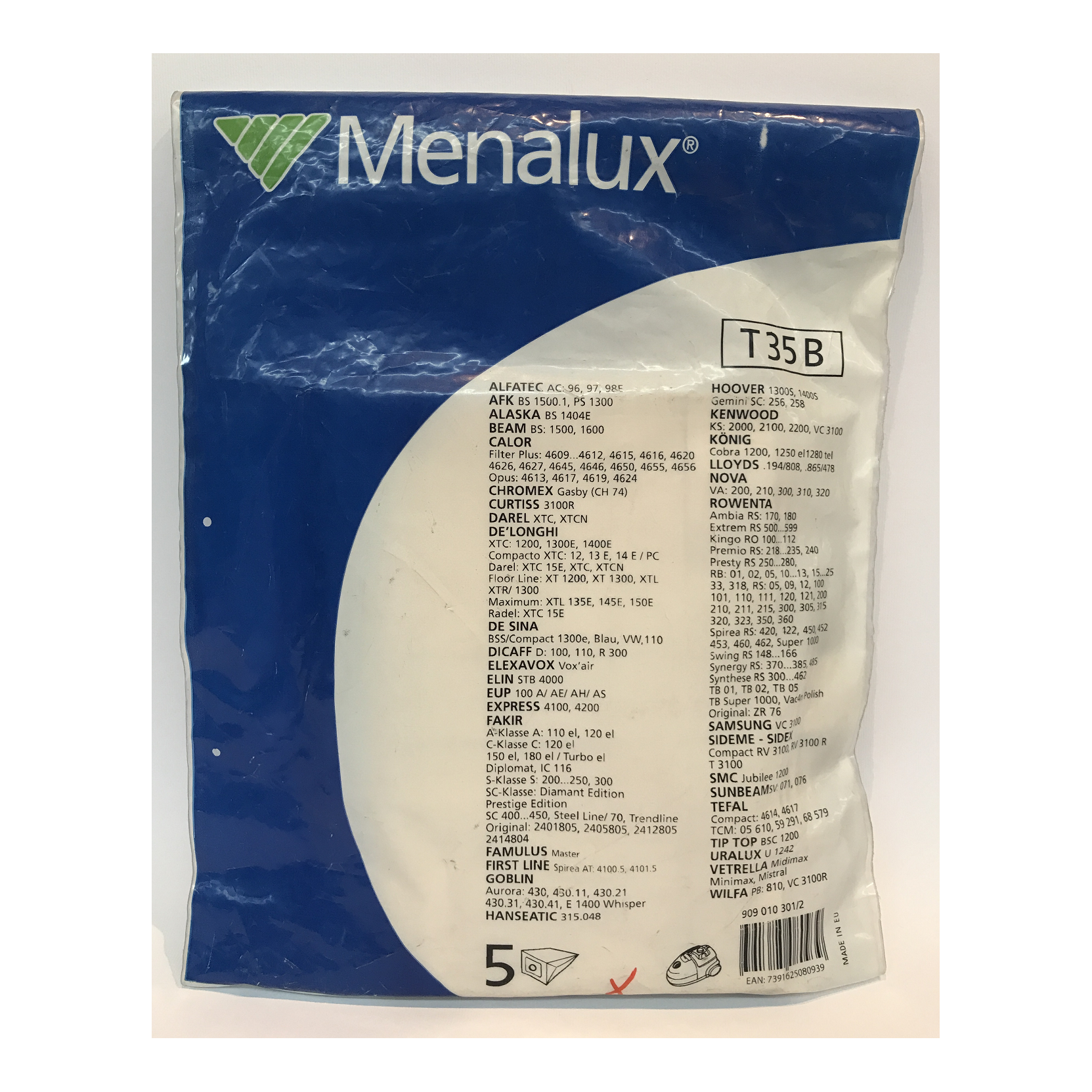 Sacchi per aspirapolvere MENALUX T35B compatibili per Rowenta Ambia,Kingo,Premio,Swing, Samsung VC3100,TipTop, Tefl Compact 4614, Vetrella Mistral Wilfa, Goblin Fakir Prestige, Diplomat, Delonghi XTC1200, Compacto, Darel, CALOR;Alaska, Elexavox, Kenwood Ks2000, Vc3100, Hoover Gemini,
