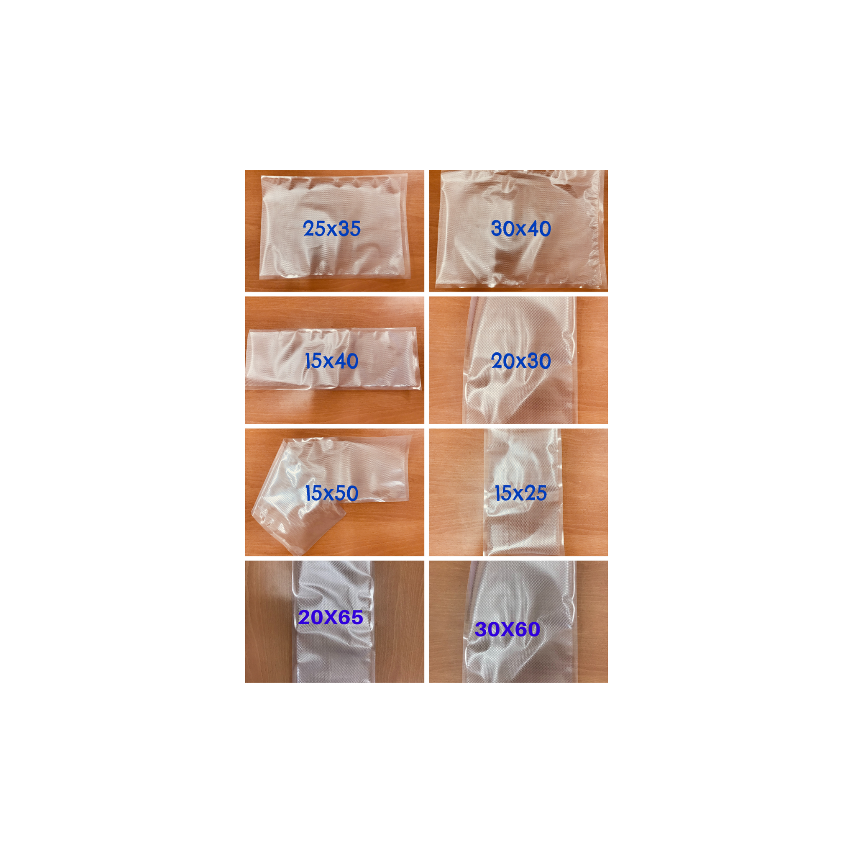 I sacchetti per sottovuoto per alimenti sono disponibili nelle misure 15x20, 15x40,15x50, 20x30, 25x35, 30x40 20x65 30x60 seleziona la misure di sacchi preferiti