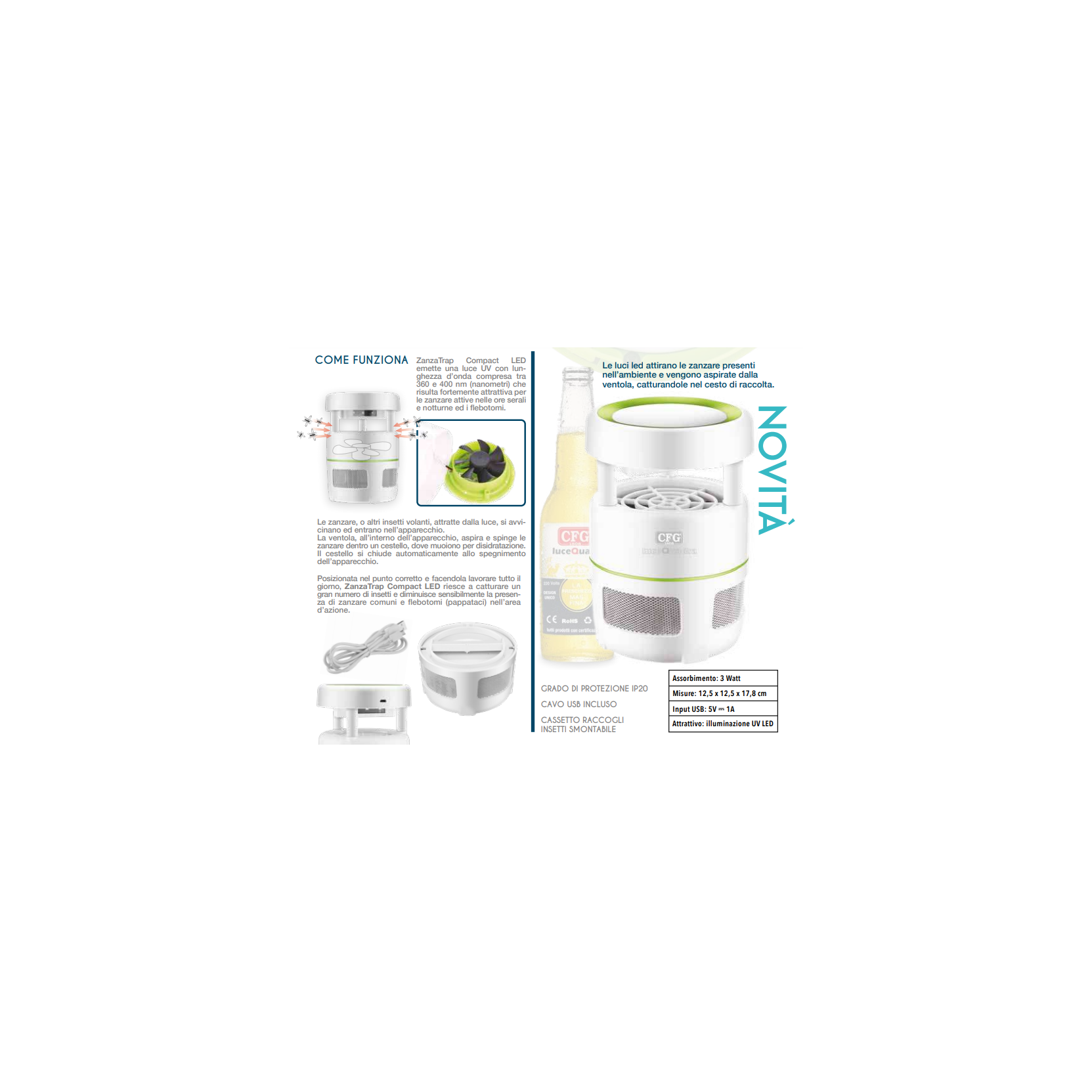 ZANZATRAP COMPACT LED è un efficace cattura zanzare adatto per interno, richiama e cattura mosche, zanzare flebotomi e altri insetti volanti notturni. Non usa alcuna sostanza chimica, ecologico, silenzioso attira le zanzare con la luce a Led e le aspira grazie alla potente ventol. Attacco USB alimentatore NON INCLUSO- Facile da pulire