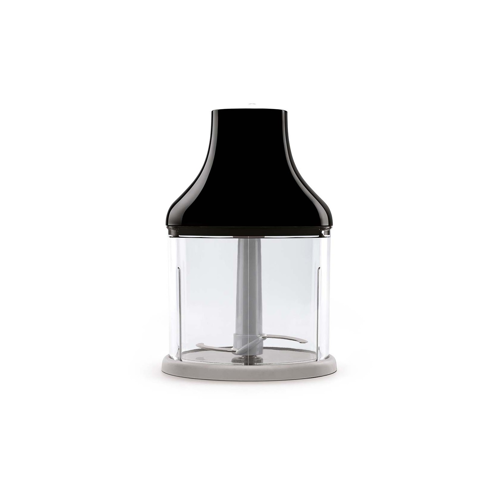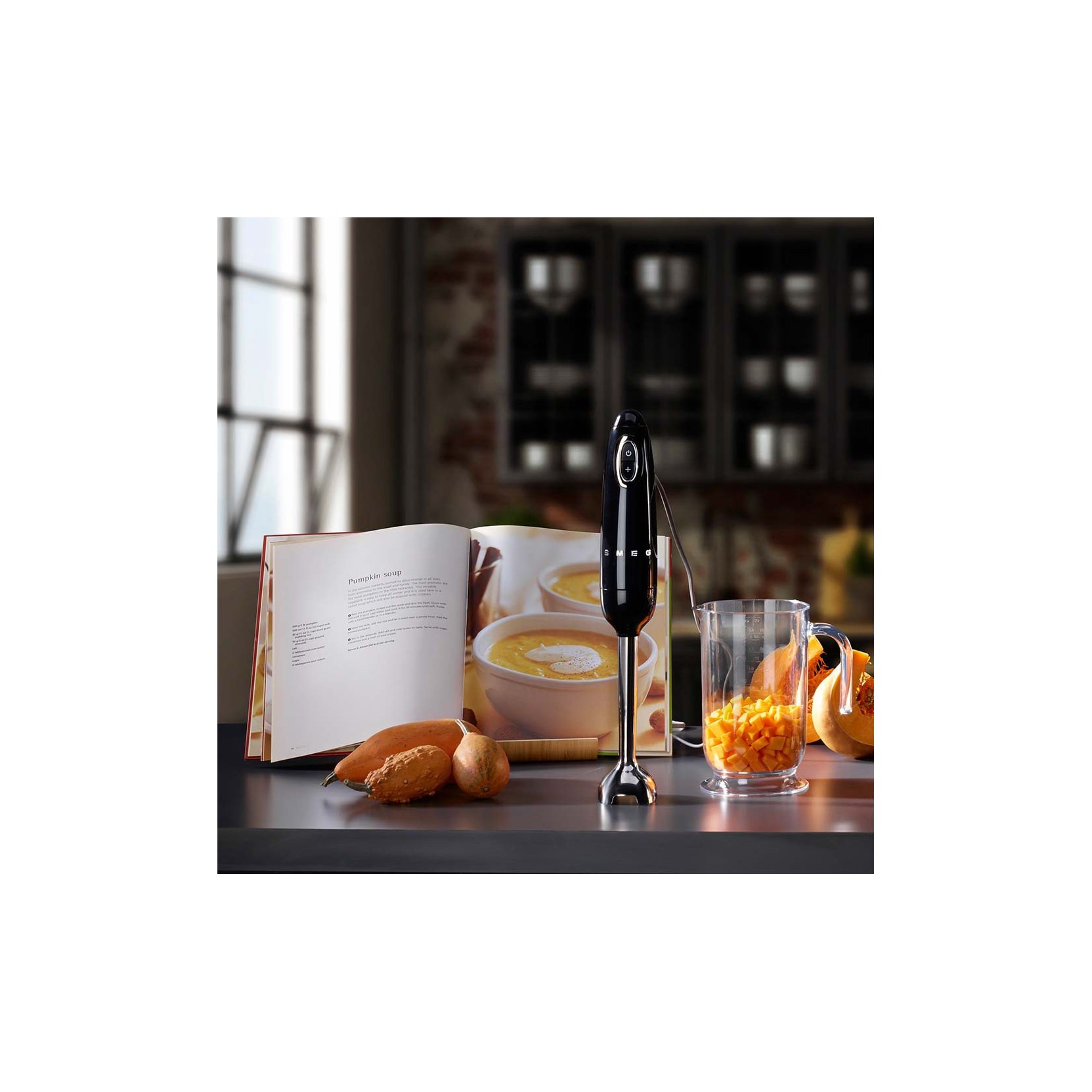 Frullatore ad immersione con asta e lame in acciaio inox, bicchiere in Tritan con capienza Lt 1,4 , mini tritatutto, frusta e schiacciaverdure. Minipimer SMEG nero è un alleato completo in cucina, per frullare, tritare, passare, montare.