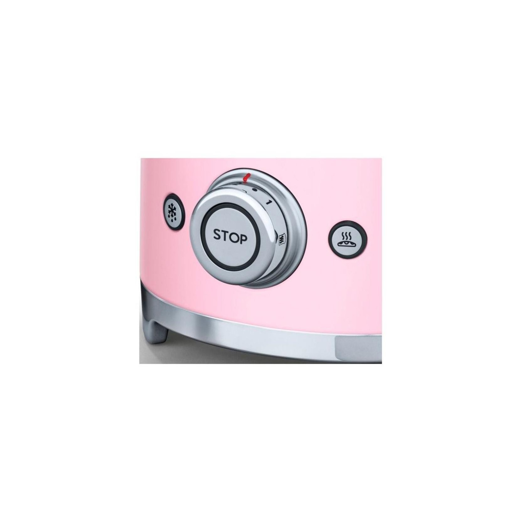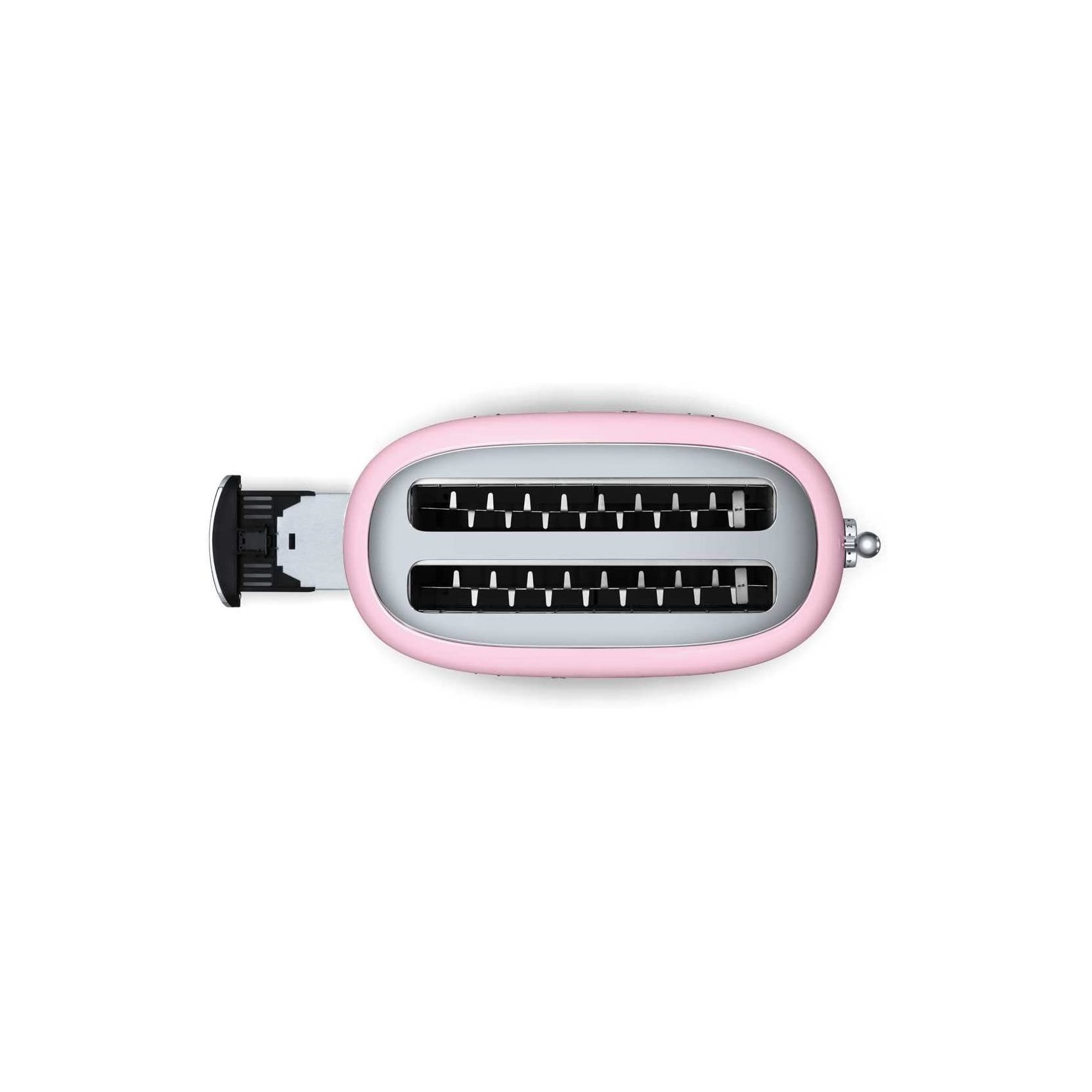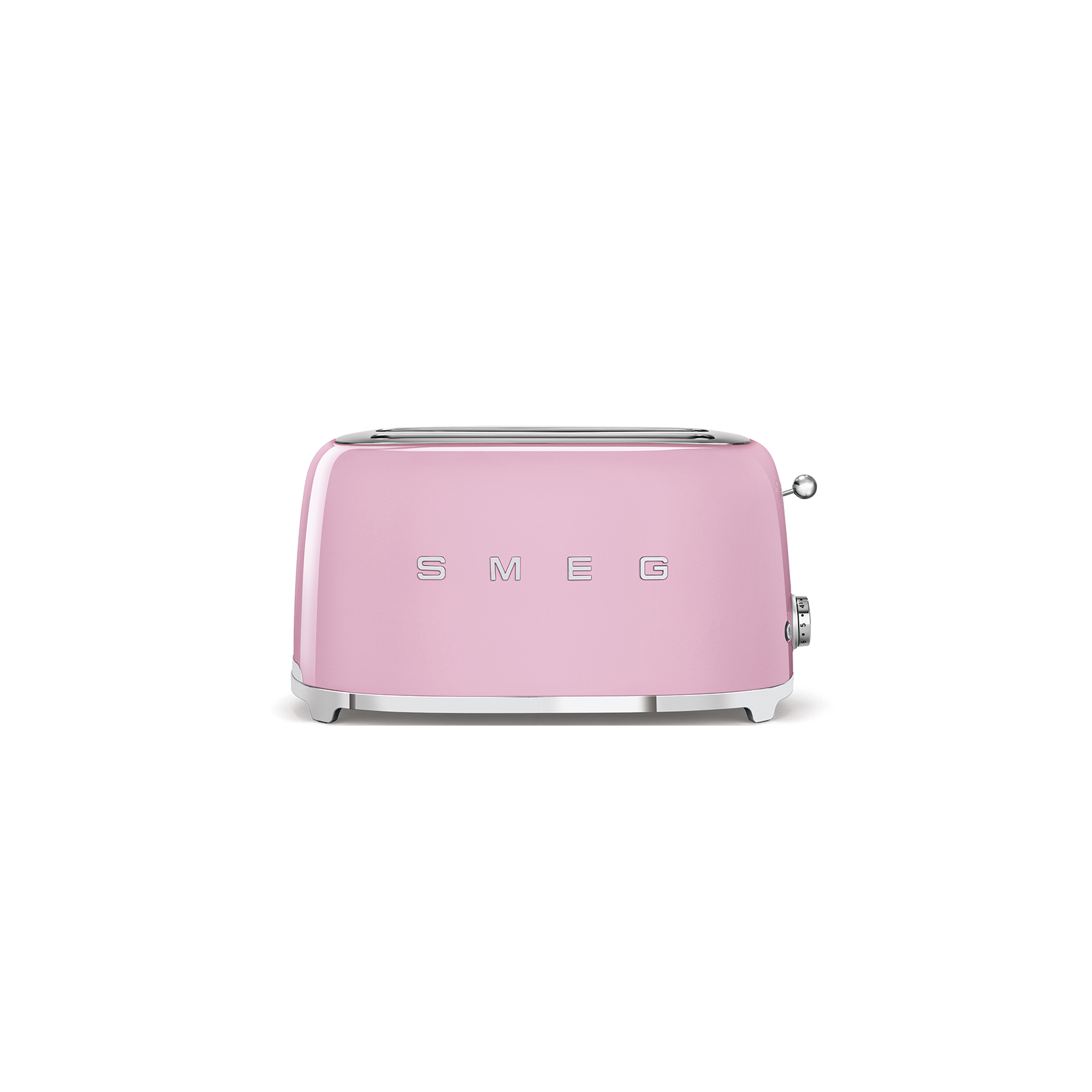 Tostapane Smeg colore Rosa ideale per 4 toast o pane da sandwich, piadine, bruschette grazie all'imboccattura più lunga. Linea smeg anni 50 Pink con finiture cromate, 6 livelli di doratura, funzione scongelamento.