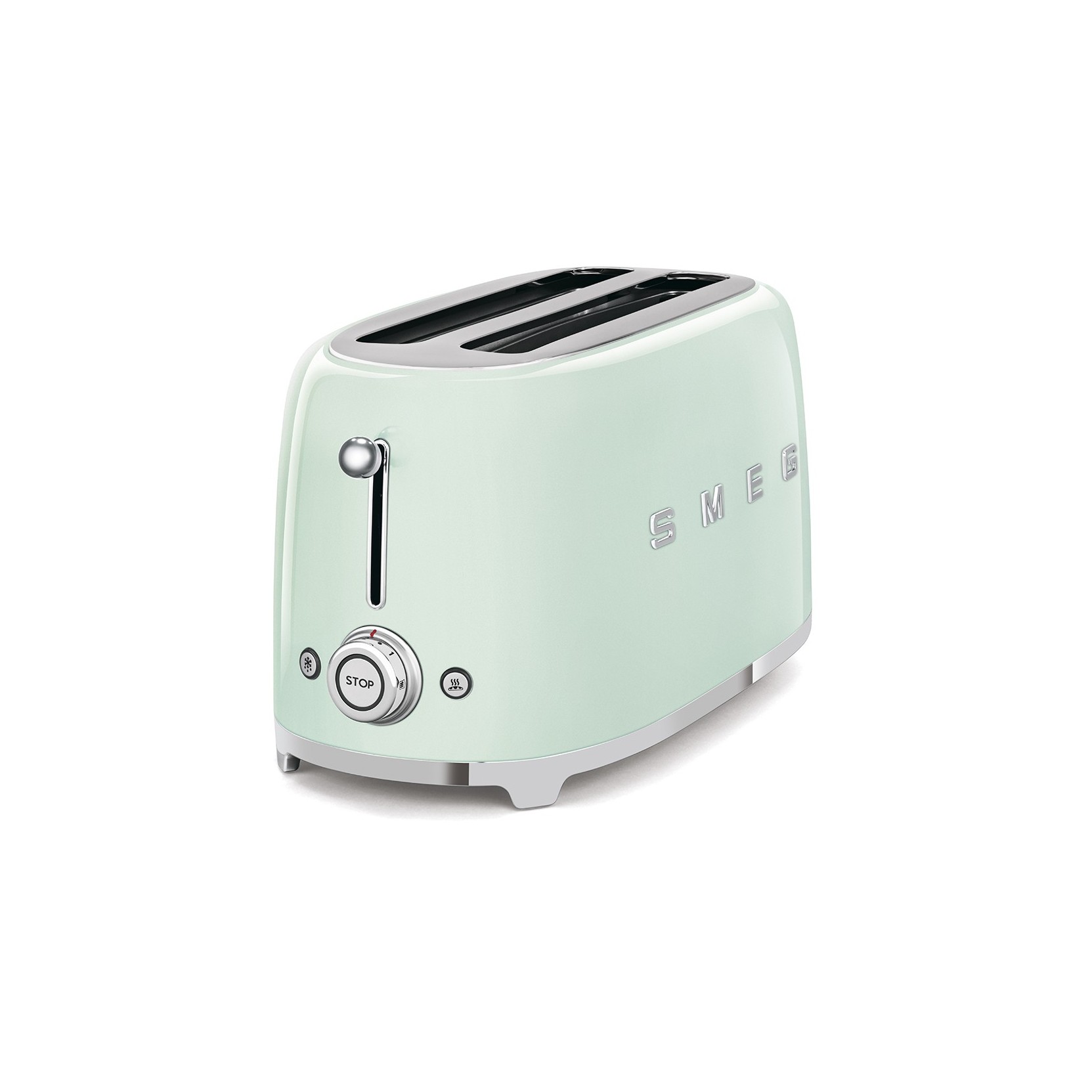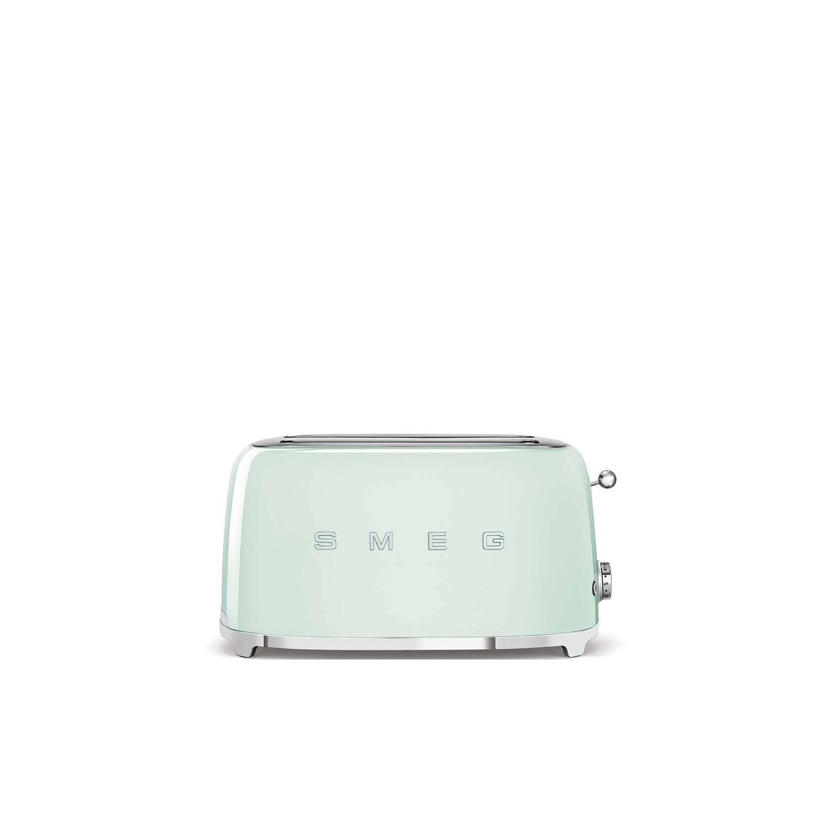 Tostapane Smeg colore Verde Pastello ideale per 4 toast o pane da sandwich, piadine, bruschette grazie all'imboccattura più lunga. Linea smeg anni 50 con finiture cromate, 6 livelli di doratura, funzione scongelamento.