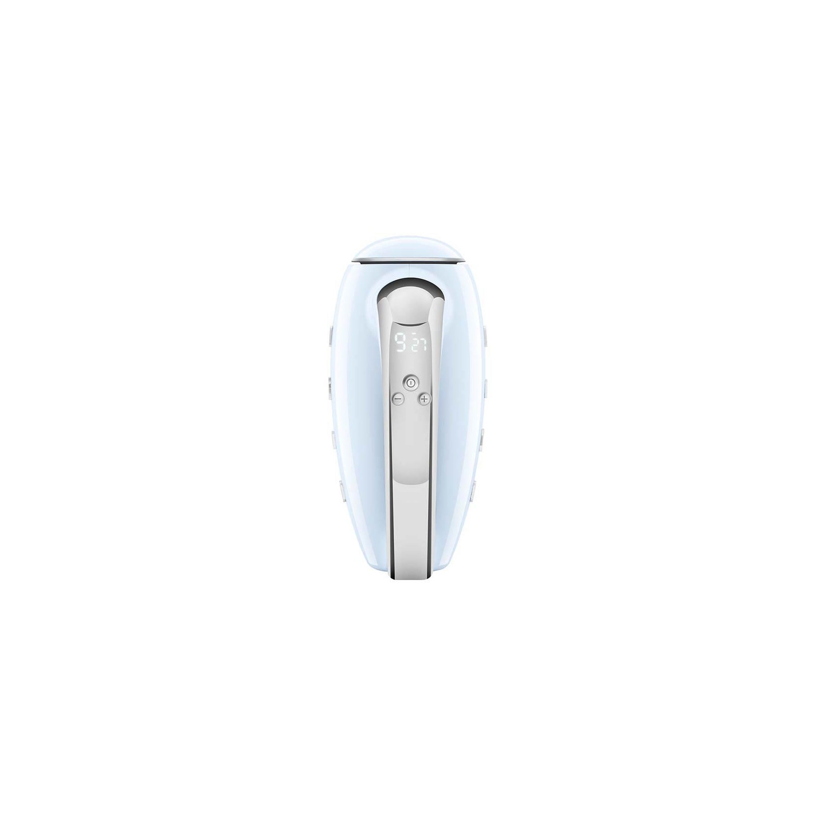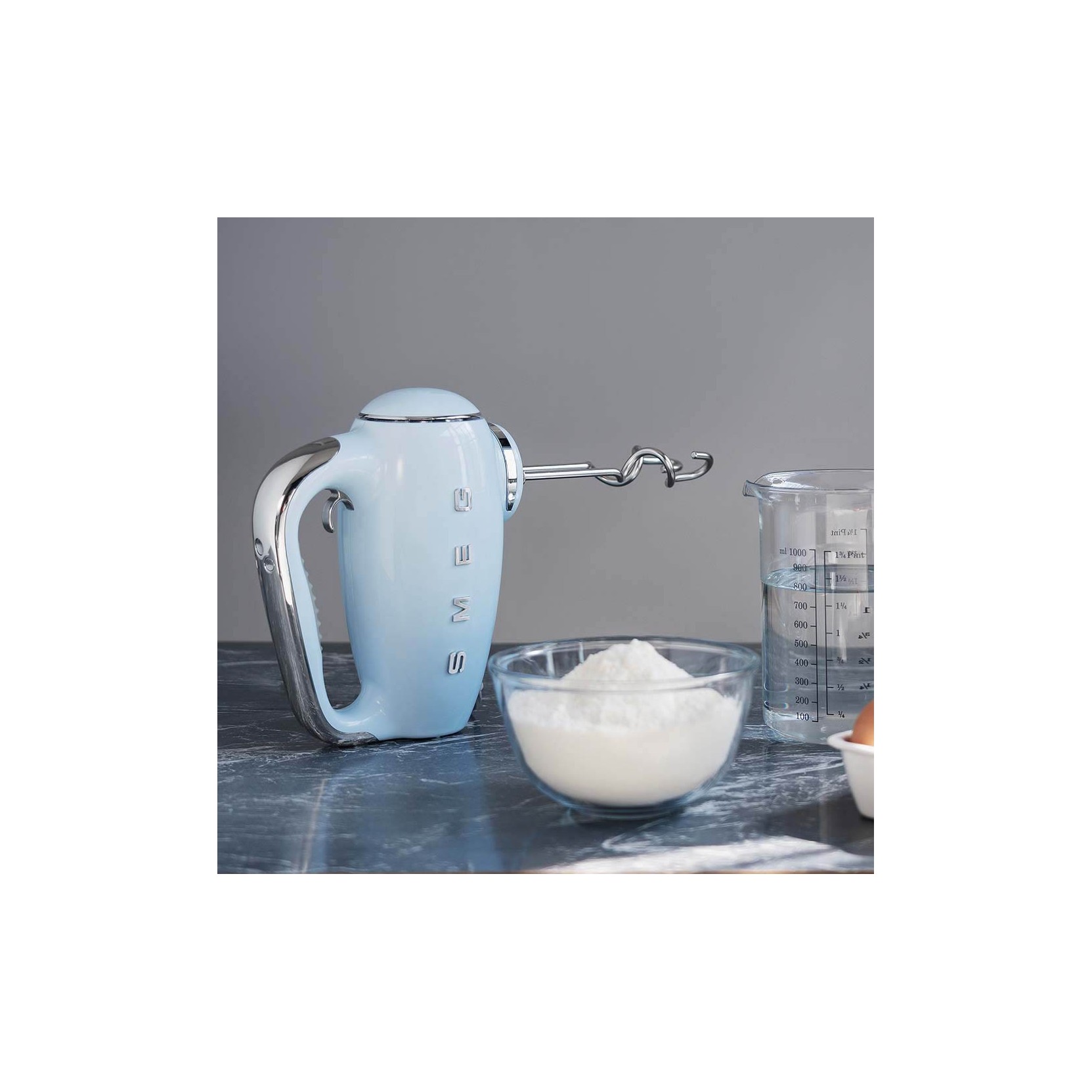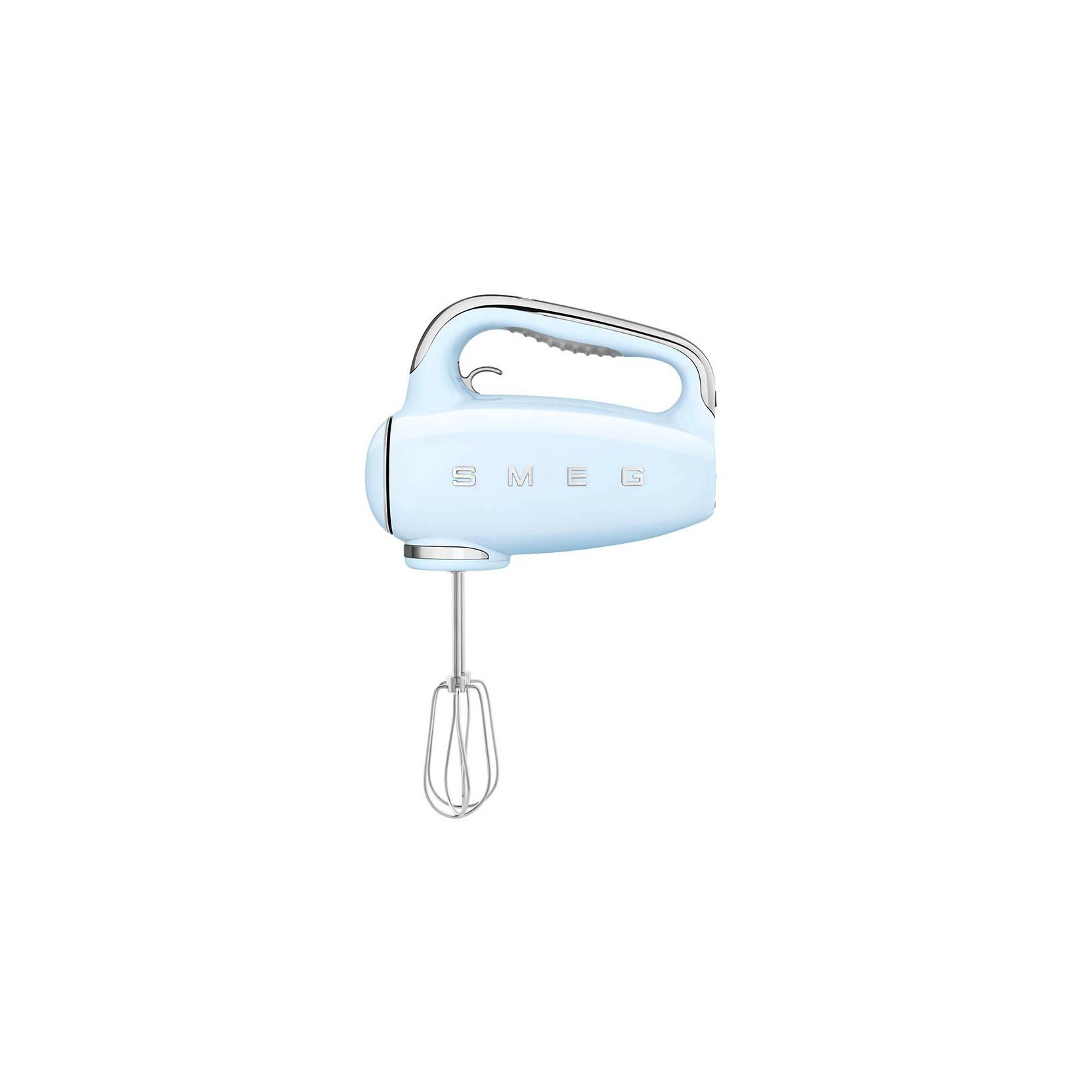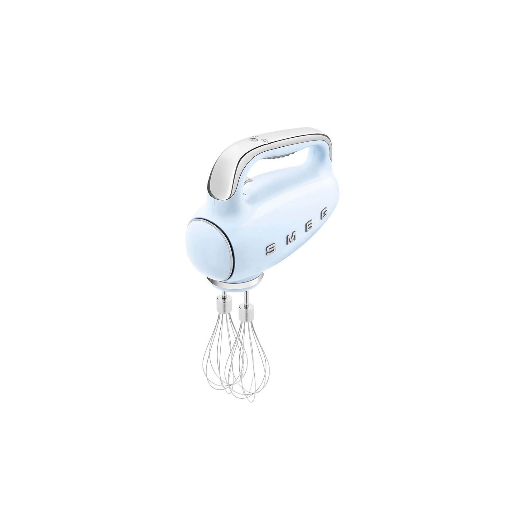Sbattitore per dolci, uova e panna della linea Smeg50style colore Azzurro, finiture in cromo. dotato di 3 tipi di fruste, fruste a filo, fruste a spirale fruste classiche. Controllo velocitò digitale, maniglia anti-scivolo.