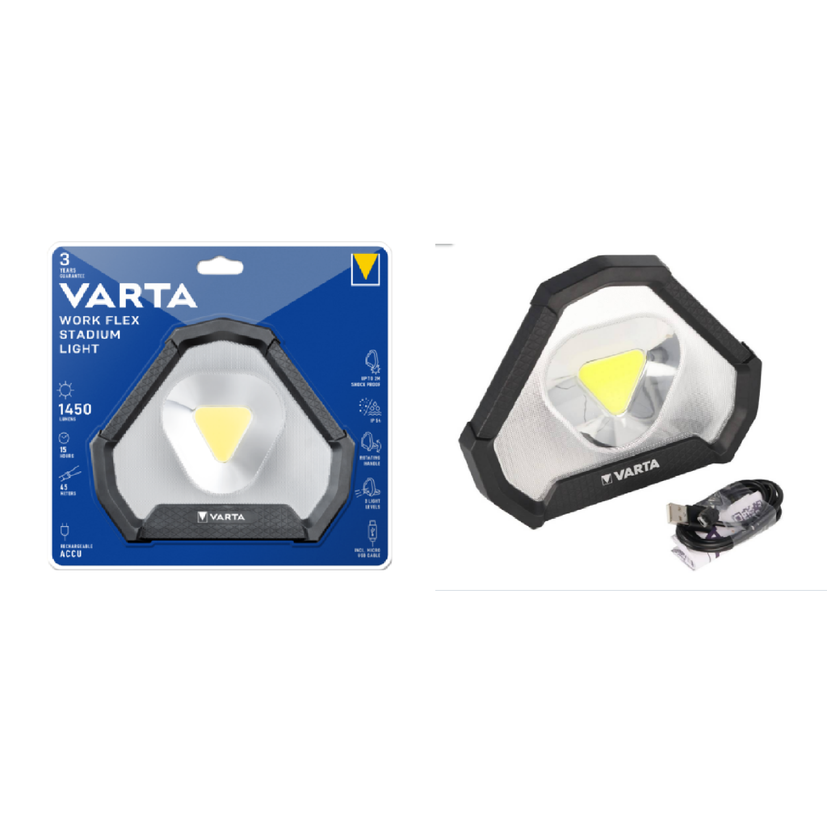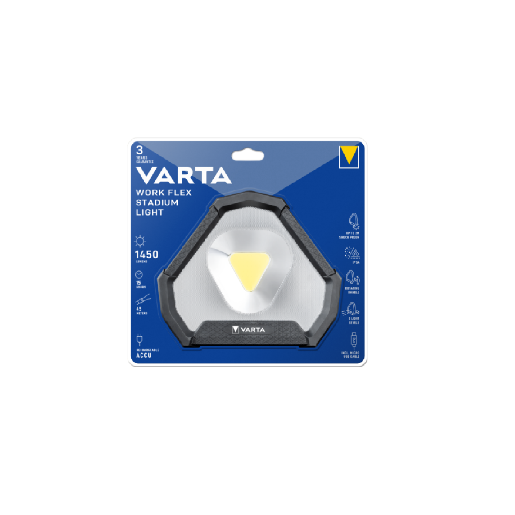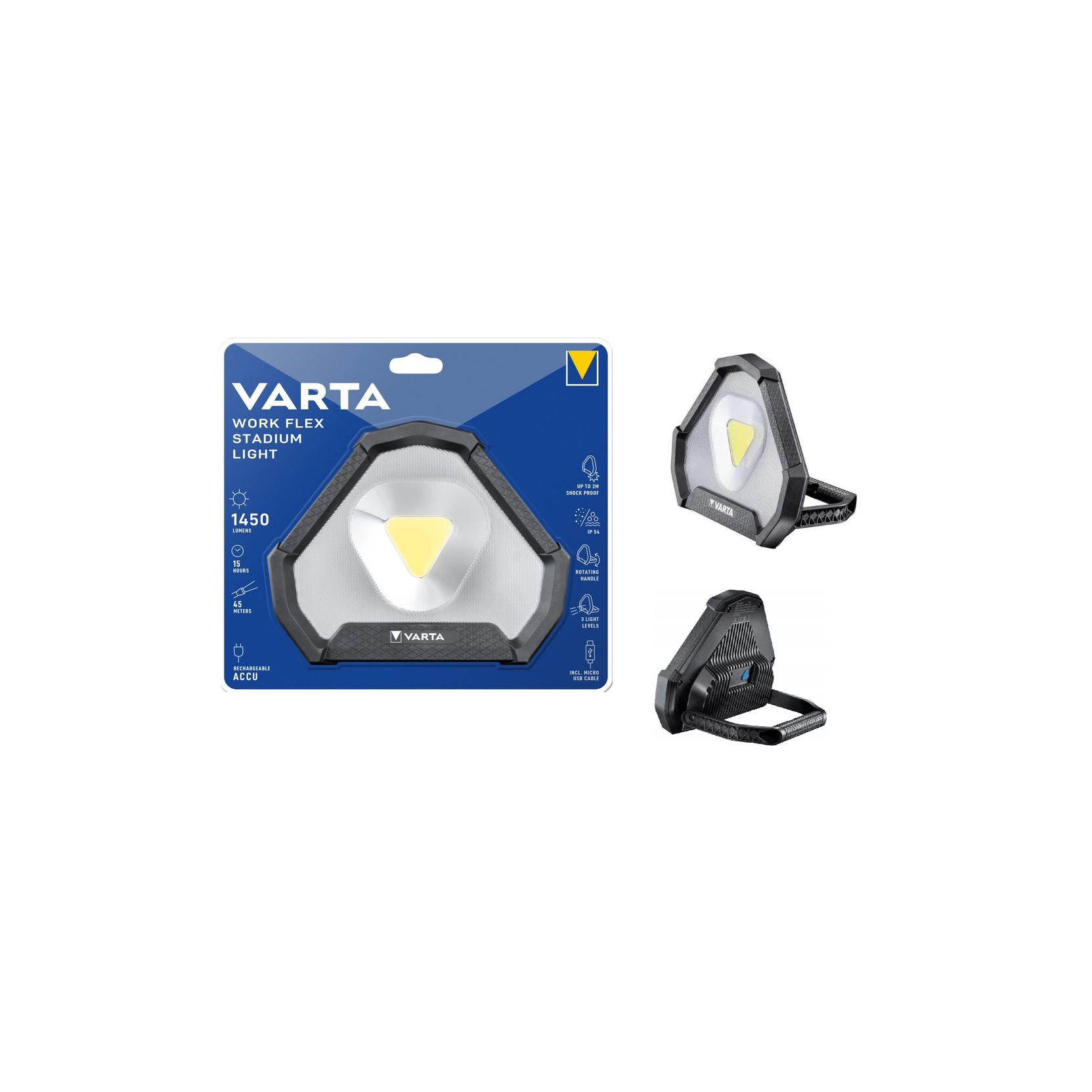 Torcia da lavoro alta luminosità COB LED 1450lumen visibilità fino a 45metri, ricaricabile batterie aglio ioni, antiacqua IP54 ,robusta e regolabile in 7 posizioni. Varta WORK FLEX STADIUM Light è la torcia ideale per ogni tipo di lavoro. 3 Intensità di luce, utilizzo fino a 15 ore, indicatore livello batteria.