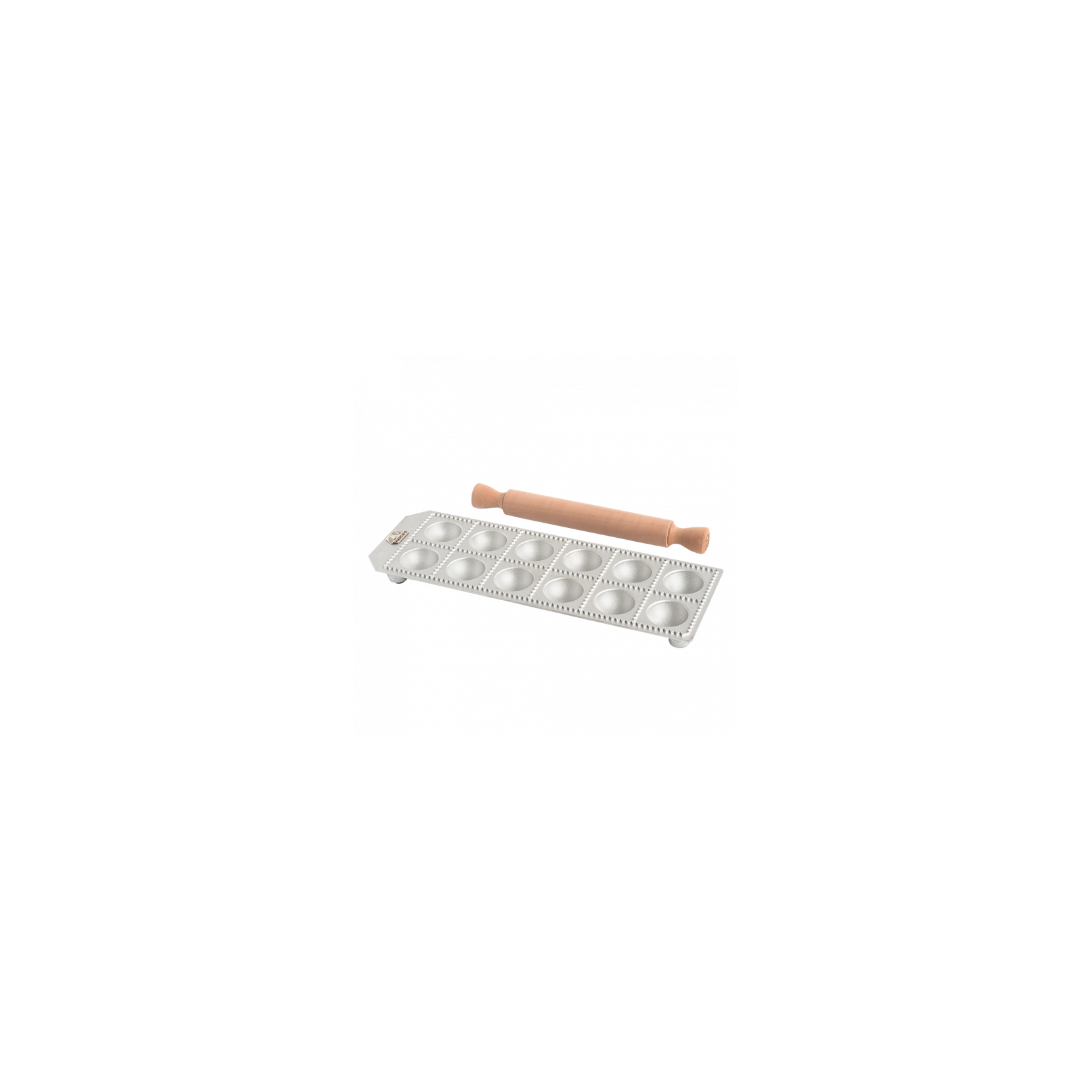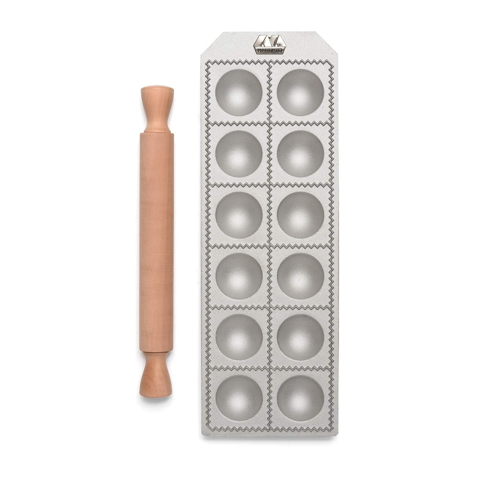 Raviolatore Marcato con mattarello in legno, prepara velocemente ottima pasta ripiena con la raviolatrice manuale. Forma 12 ravioli con interno per ripieno tondo e forma quadrata. Grandezza del raviolo 5,5cm.
