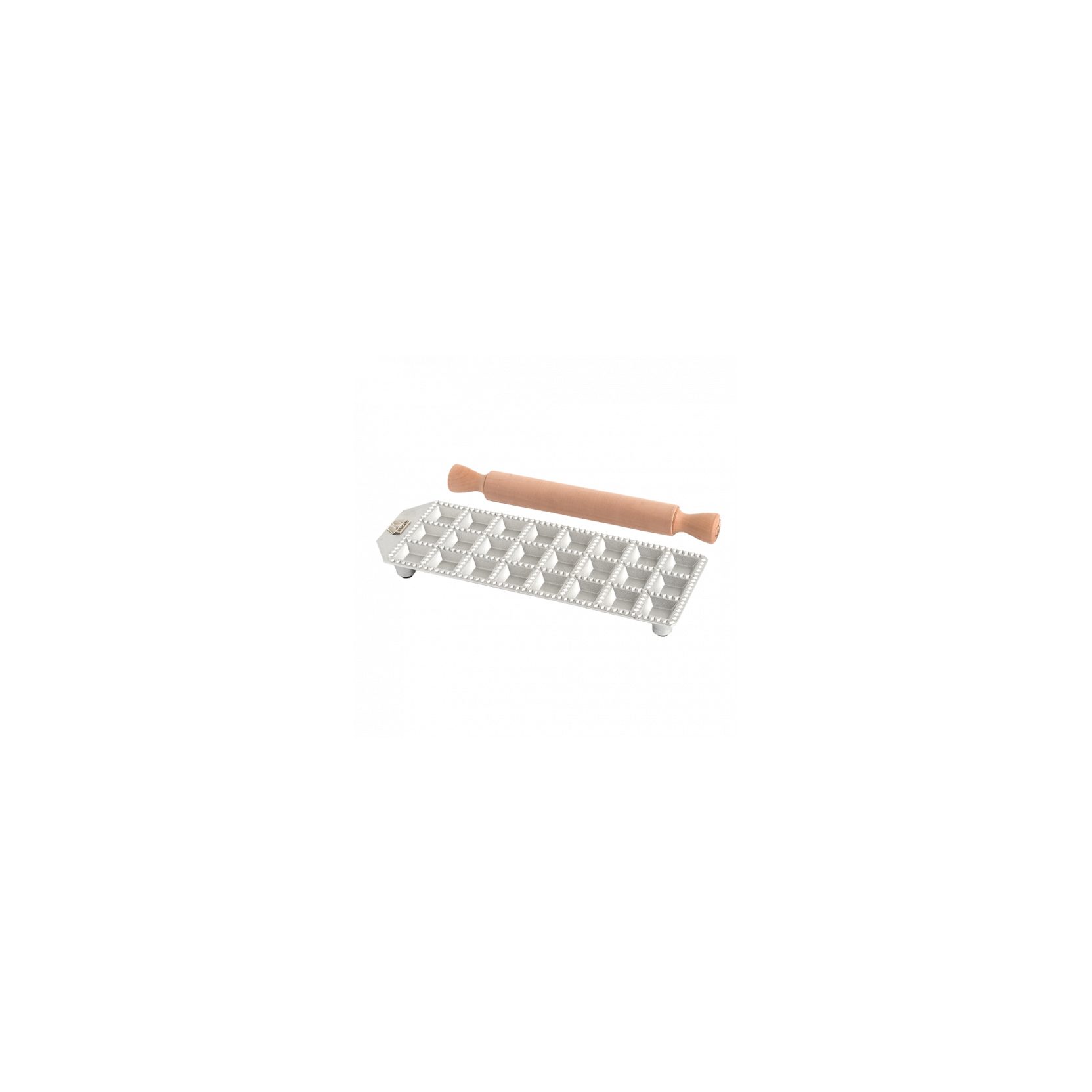 Raviolatore Marcato con mattarello in legno, prepara velocemente ottima pasta ripiena con la raviolatrice manuale. Forma 24 ravioli con interno per ripieno quadrato e forma quadrata. Grandezza del raviolo 3,5cm.
