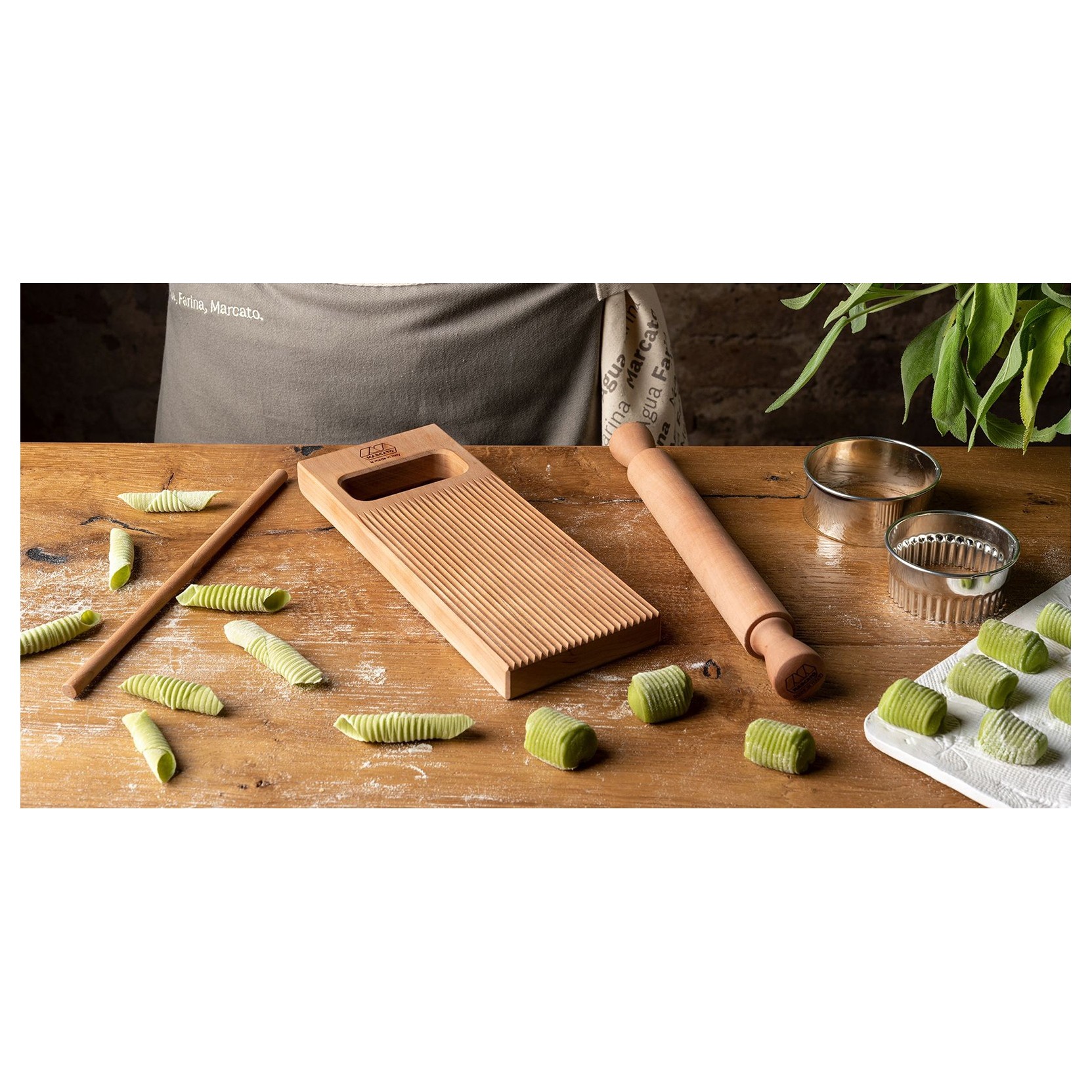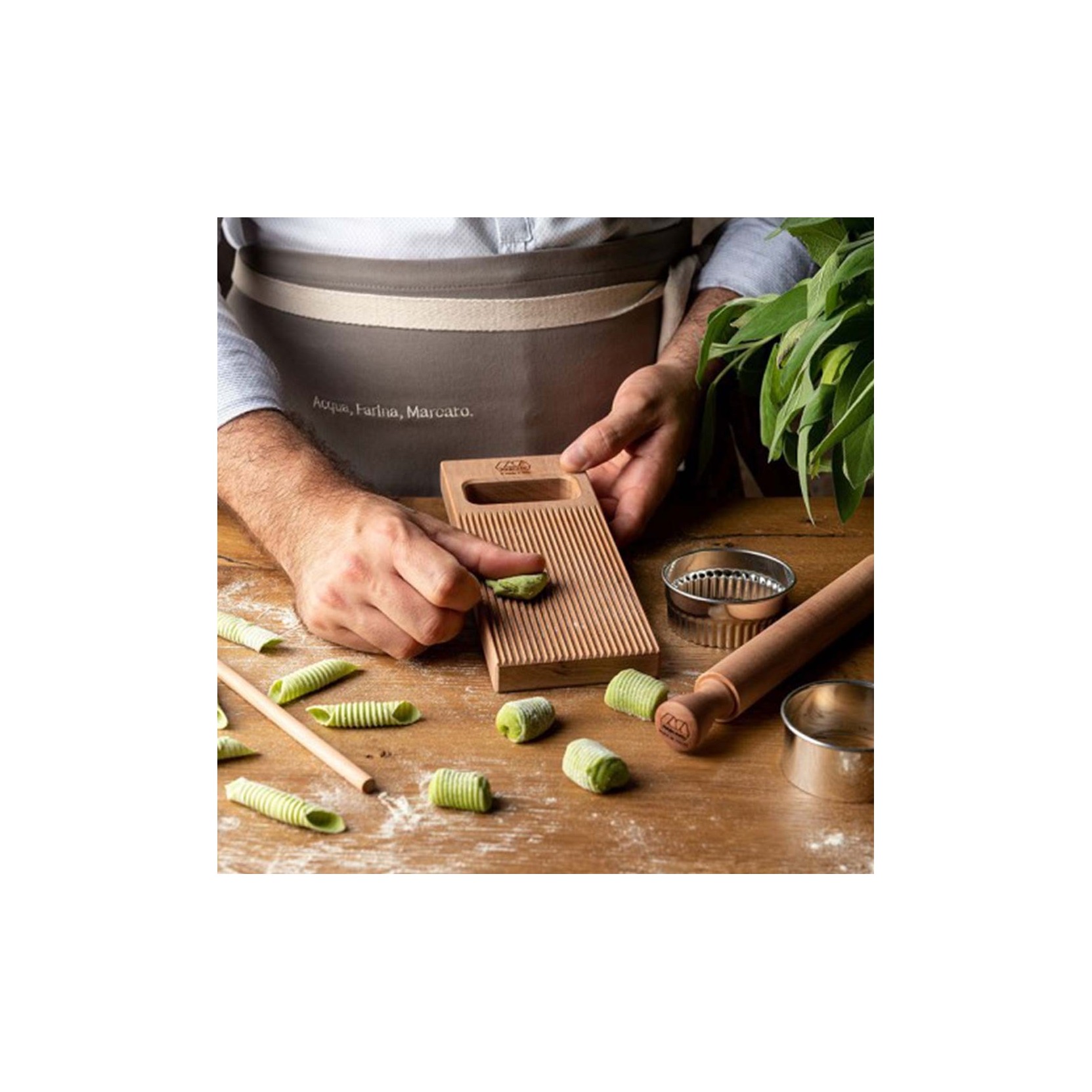 Confezione gnocchi like a pro con grembiule, mattarello, ricettario,2 coppapasta, utensile legno per garganelli e gnocchi BP-GNO