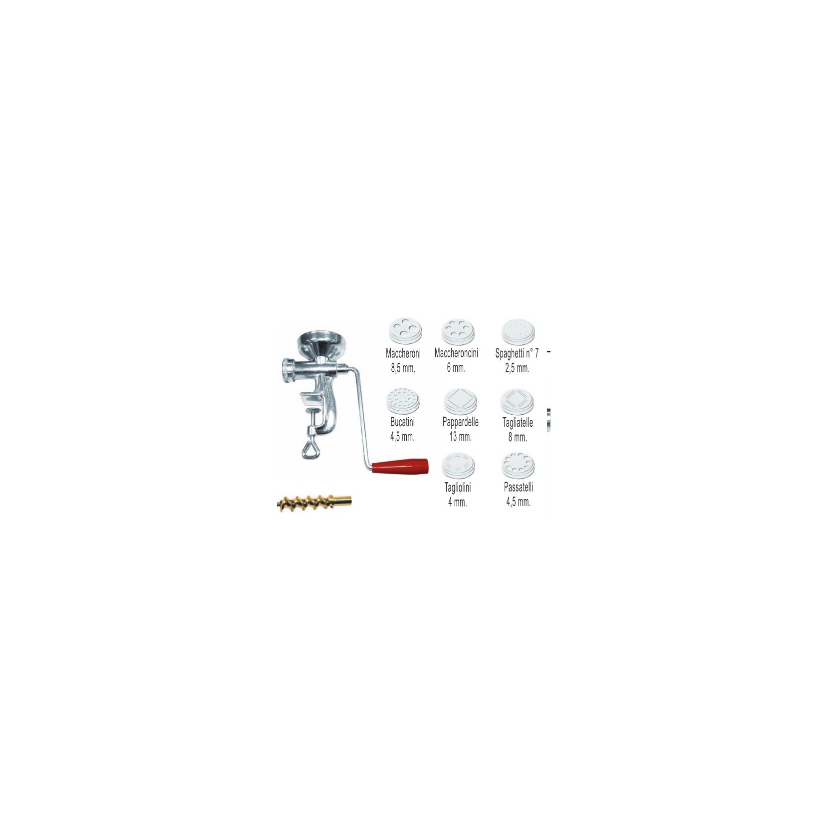 Torchietto per pasta manuale con elica in ottone e 8 trafile in resina.Corpo torchietto in alluminio presso fuso per alimenti.