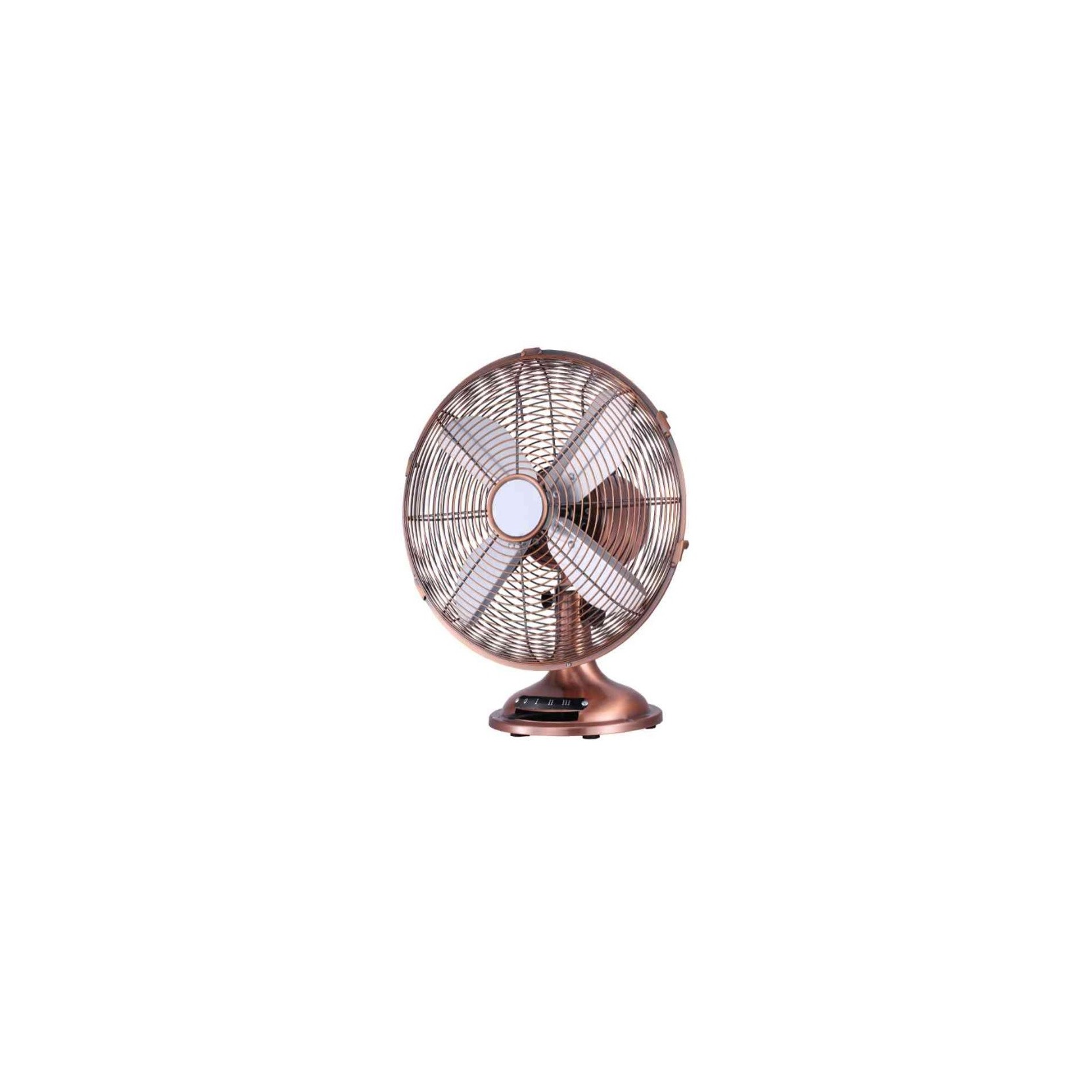 Piccolo ventilatore a 3 velocità da appoggio dal design vintage realizzato interamente in metallo, con dettagli in color rame.