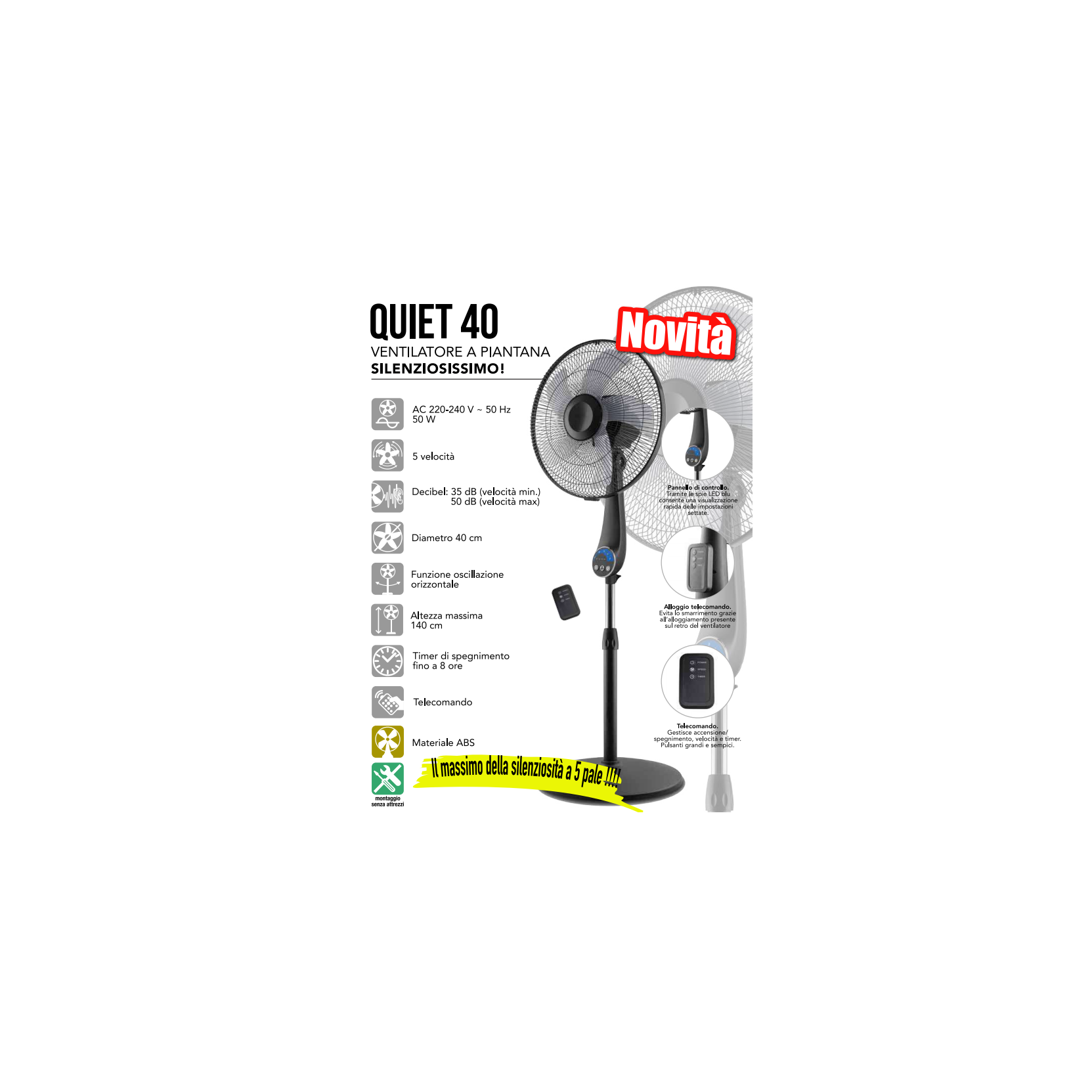- AC 220-240 V - 50Hz - Potenza: 50W - 5 velocità (bassa, media, alta) - Decibel: 35 dB (velocità min.) 50 dB (velocità max) - Diametro: 40 cm - Altezza regolabile fino a 140 cm - Telecomando con alloggio sul retro - Timer di spegnimento fino a 8 ore - Materiale ABS - Peso netto: 5,8 Kg
