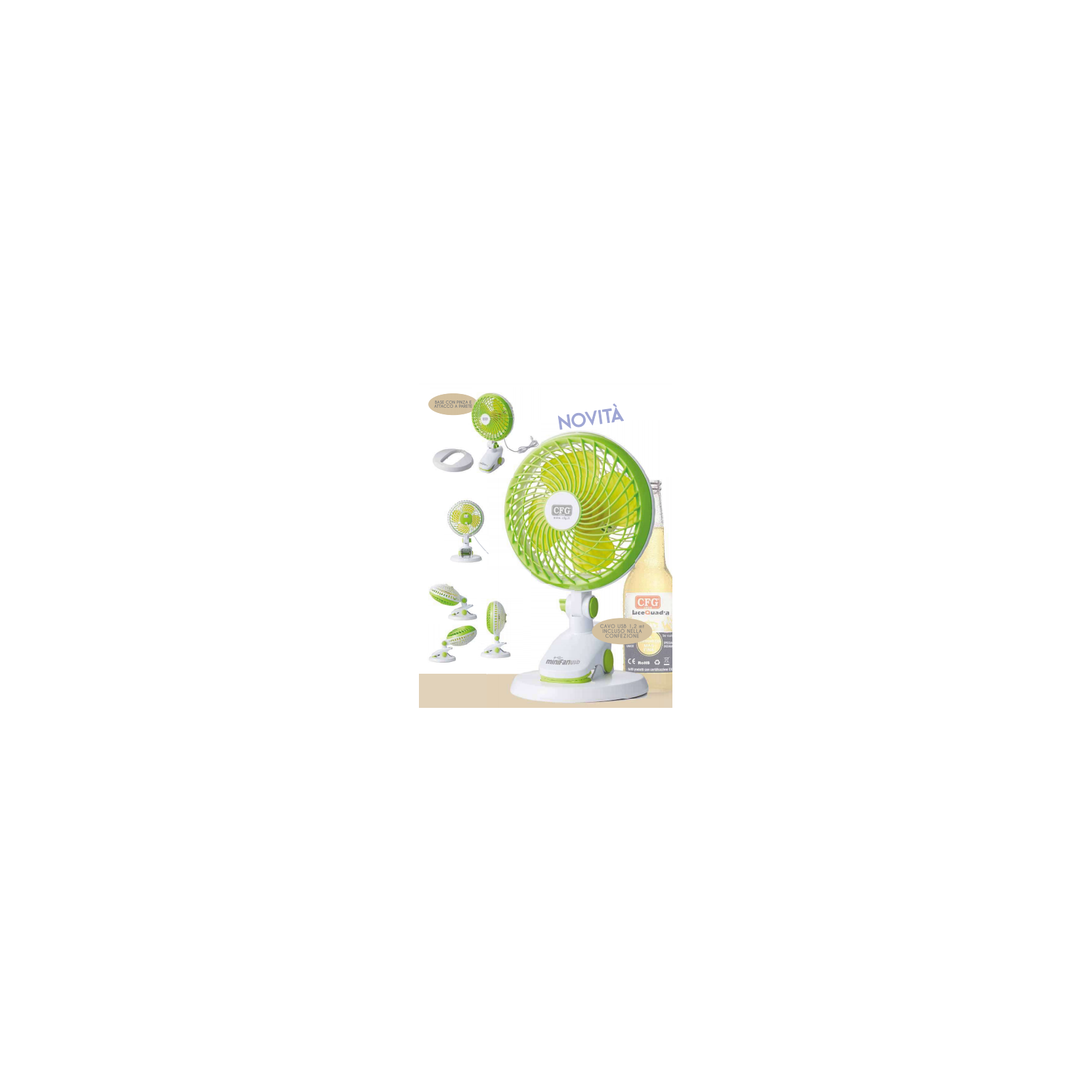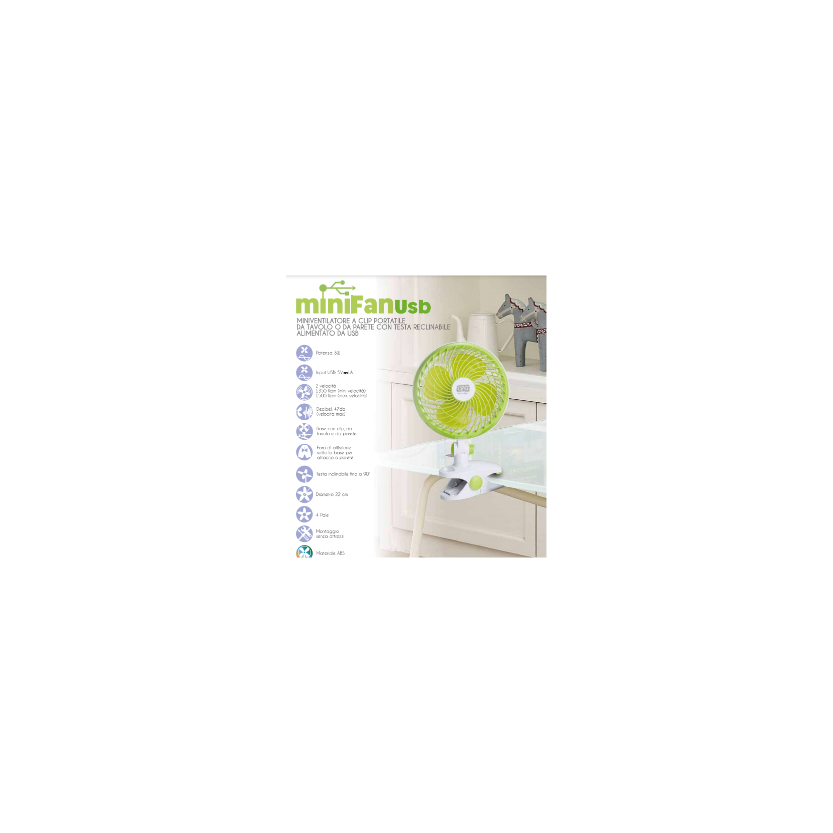 MINI VENTILATORE DA APPOGGIO, TAVOLO O CON PINZA MINIFANUSB DI CFG- Potenza: 3W - 2 velocità:1350 R/Min (min. velocità) - 1500 R/Min (max velocità) - Input USB: 5V --- 1A - Decibel: 47 dB (max velocità) - Altezza: 31 cm - Base con clip, da tavolo e da parete - Foro di affissione sotto la base per attacco a parete - Diametro 22 cm - Testa inclinabile fino a 90° - 4 pale - Montaggio senza attrezzi - Matriale: ABS - Dimensioni: 16,5 x 18,9 x 31 (h) cm